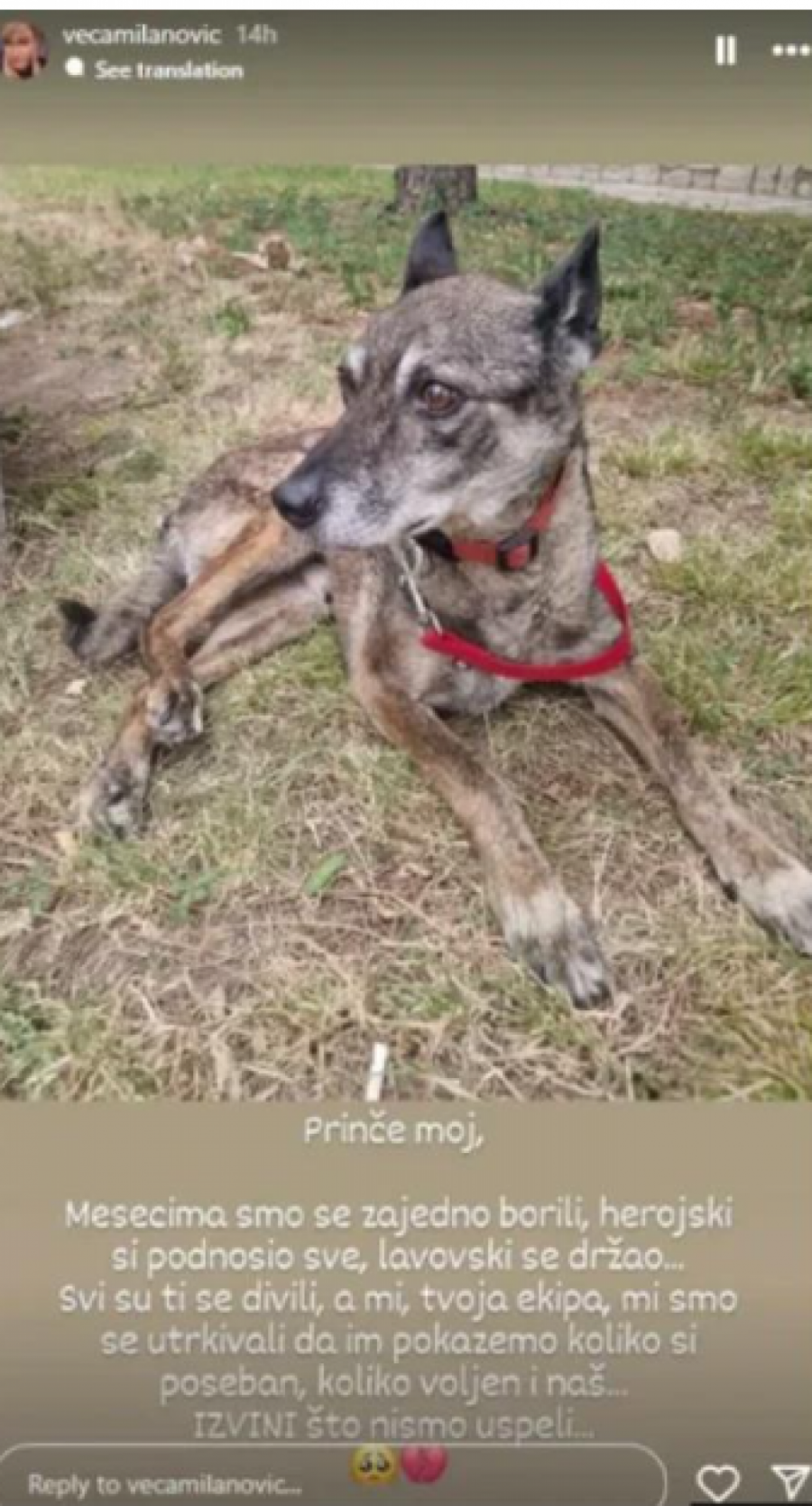 - Prinče moj, mesecima smo se zajedno borili, herojski si podnosio sve, lavovski se držao. Svi su ti se divili, a mi, tvoja ekipa, mi smo se utrkivali da im pokažemo koliko si poseban, koliko voljen i naš. Izvini što nismo uspeli - napisala je Vesna uz fotografiju psa koji je godinama bio deo ove produkcije Grand.