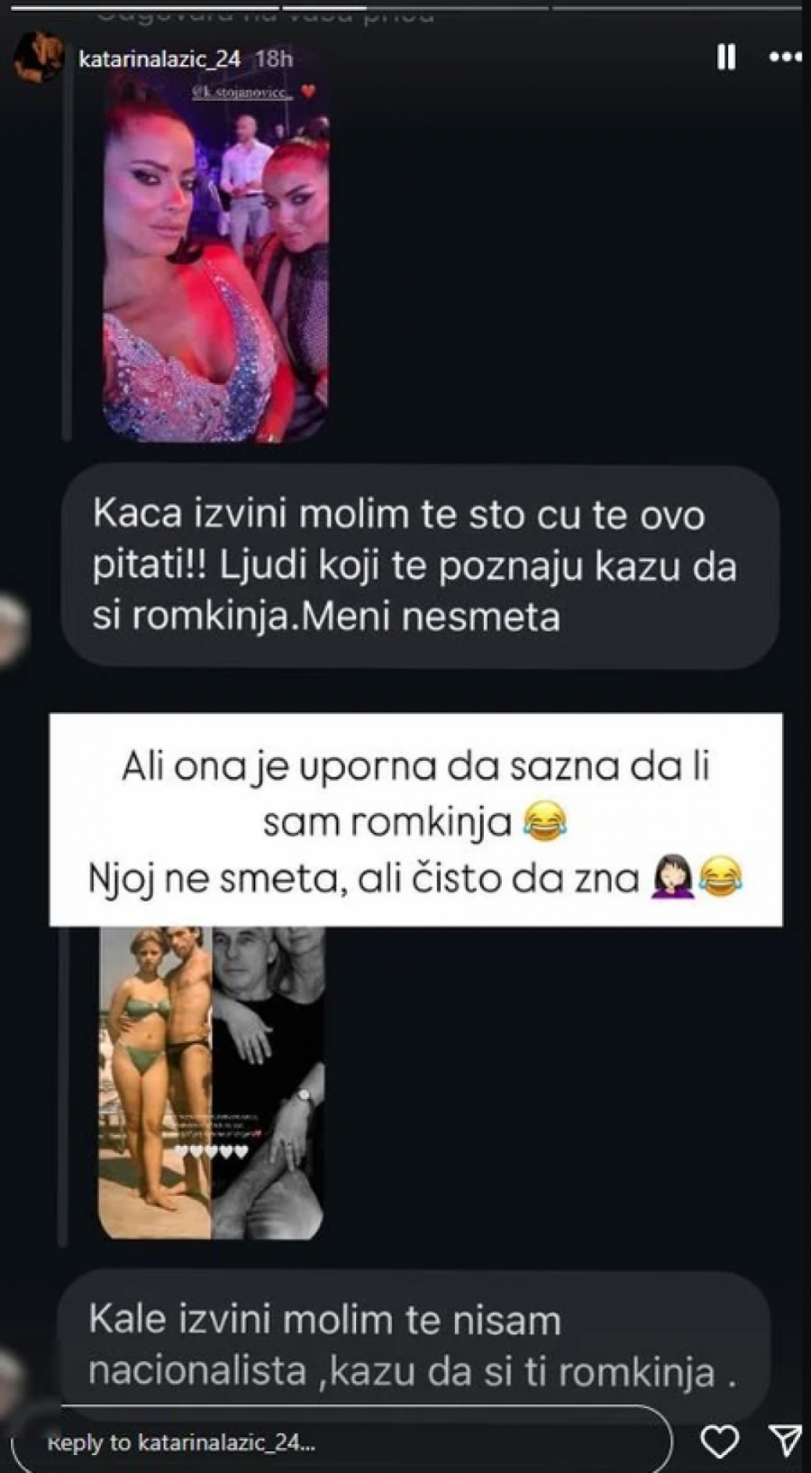 - Kaća, izvini molim te što ću te ovo pitati. Ljudi koji te poznaju kažu da si Romkinja, meni ne smeta - glasila je jedna poruka, a onda je usledio sličan nastavak od iste korisnice ove društvene mreže: