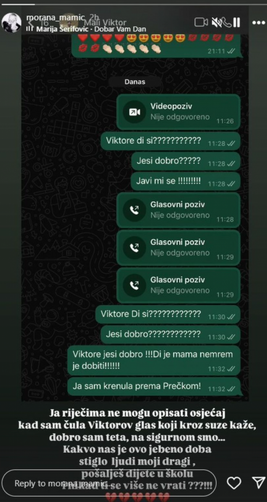 - Viktore, gde si? Jesi dobro? Gde je mama, ne mogu je dobiti? Krenula sam prema Prečkom - pisala je Morana dečaku koji se nije javljao na telefon.