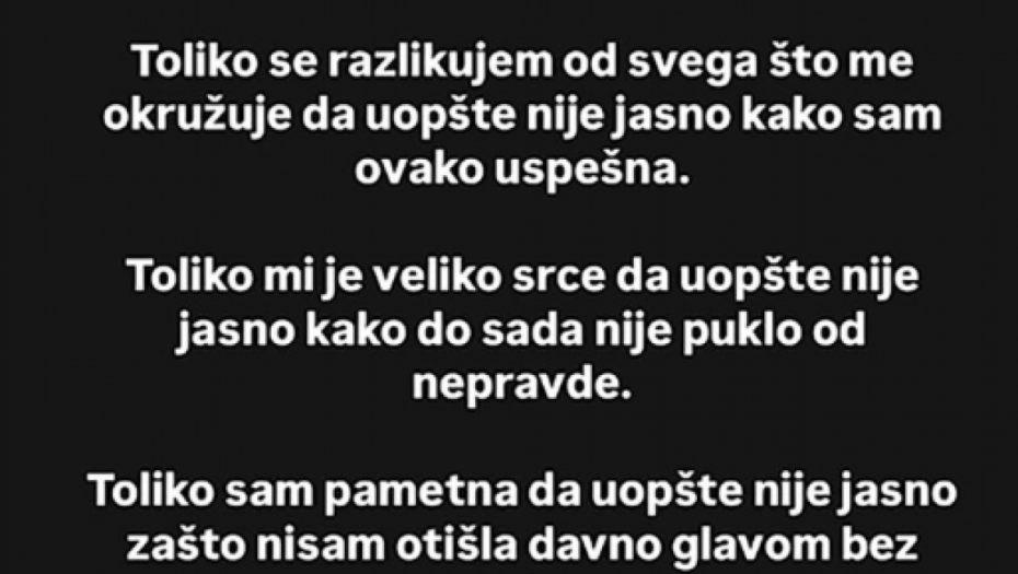 - Toliko sam pošten i hrabar čovek da uopšte nije jasno kako sam preživela sve ove godine u moru mržnje i zla u kom plivam. Toliko se razlikujem od svega što me okružuje da uopšte nije jasno kako sam ovako uspešna. Toliko mi je veliko srce da uopšte nije jasno kako do sada nije puklo od nepravde - napisala je Karleuša, pa dodala: