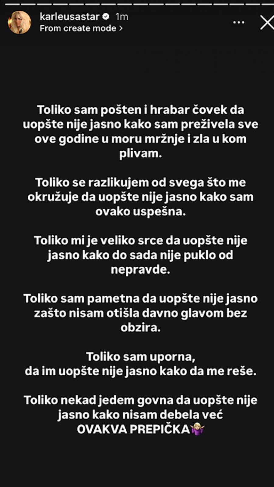 - Toliko sam pametna da uopšte nije jasno zašto nisam otišla davno glavom bez obzira. Toliko sam uporna, da im uopšte nije jasno kako da me reše. Toliko nekad jedem go*na da uopšte nije jasno kako nisam debela već ovakva prep**ka - napisala je Karleuša.
