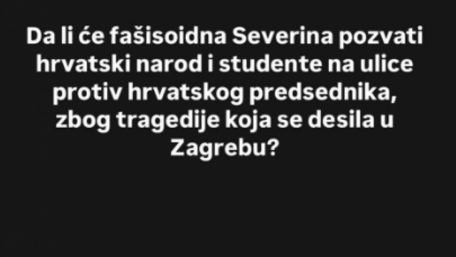 - Da li će hrvatski predsednik i studenti izaći na ulice zbog tragedije koja se desila u Zagrebu? Da li će fašisoidna Severina pozvati hrvatski narod i studente na ulice protiv hrvatskog predsednika zbog tragedije koja se desila u Zagrebu? - napisala je Jelena.