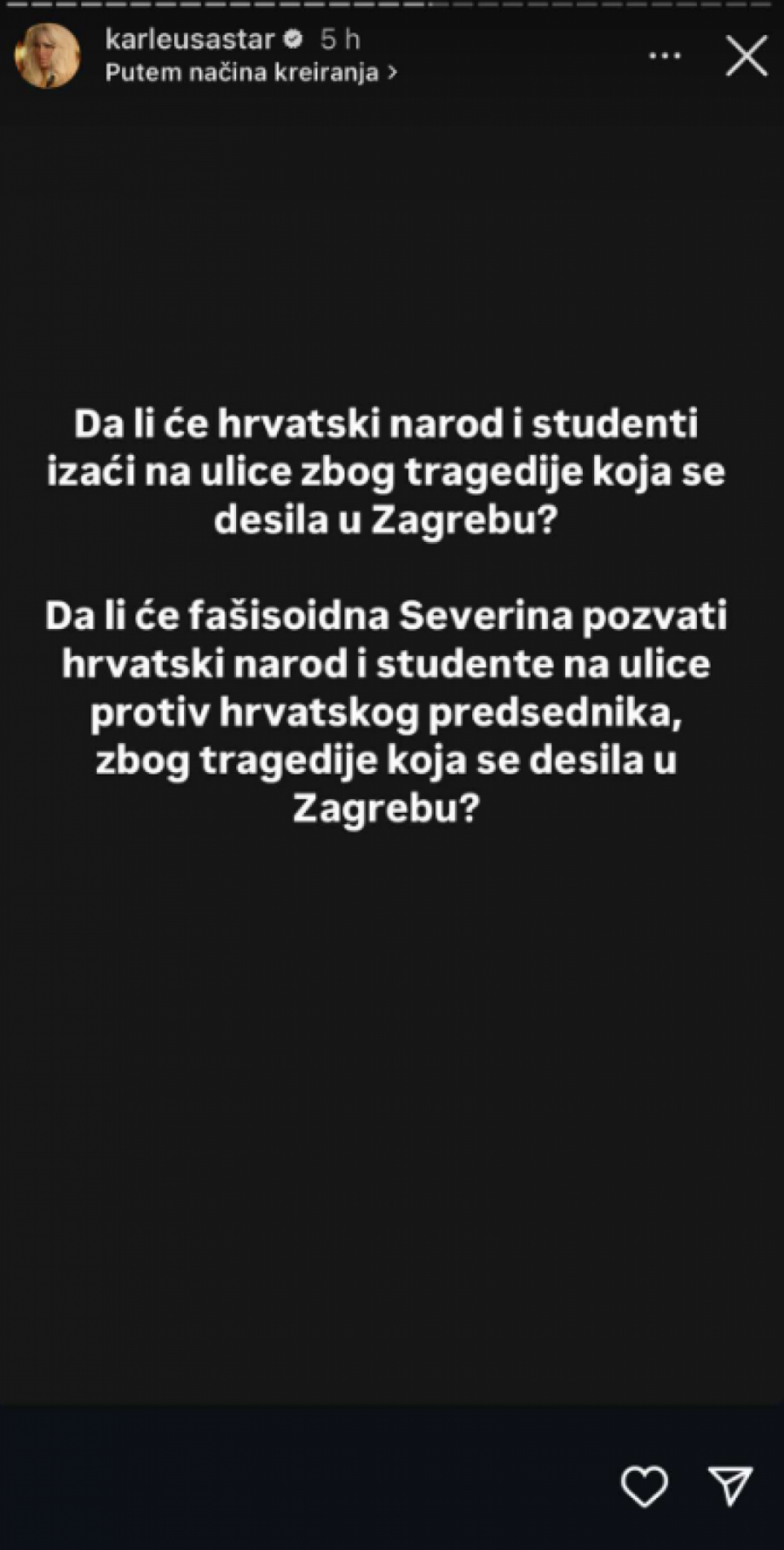 - Ko je hrvatski predsednik? Da li je to onaj koji kaže istinu da je Kosovo nelegalno oteto od Srbije? Ako je to taj, gledala sam na Tiktoku, onda ga podržavam. Ne znam kako se zove, ali ima mu*a. Pozivam narod Hrvatske da podrži srpsko stradanje na Kosovu i osudi otimanje naše teritorije na brutalan i nelegitiman način, ali i da izađe na ulice kako bi smenili premijera i Vladu - zaključila je Karleuša.