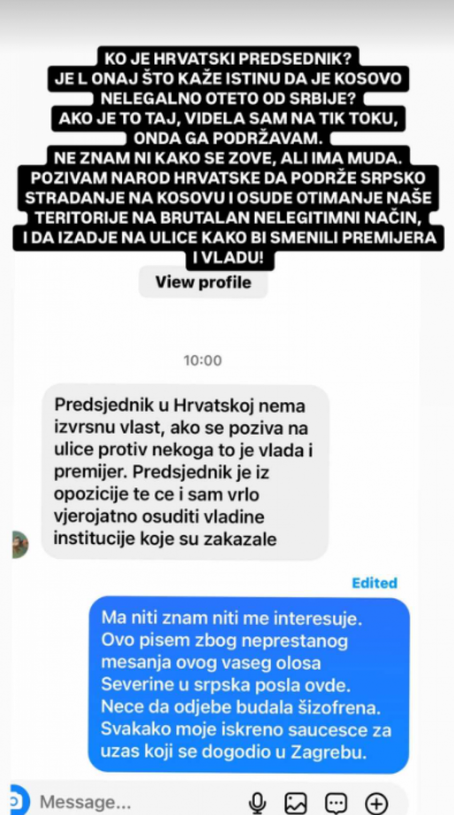 - Ma niti znam, niti me interesuje. Ovo pišem zbog neprestanog mešanja ovog vašeg ološa Severine u srpska posla ovde. Neće da odj*be budala šizofrena. Svakako moje iskreno saučešće za užas koji se dogodio u Zagrebu - odgovorila je pevačica, a zatim uz prepisku ostavila još jedan komentar.