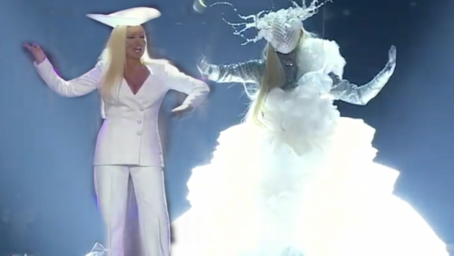 Pevačici je lice bilo pokriveno stilizovanom mrežastom maskom iz koje su izbijali cvetovi koji se granaju i formiraju rogove. Stajling je propraćen šljokičavom kreacijom na koju se nadovezivala haljina od tila.