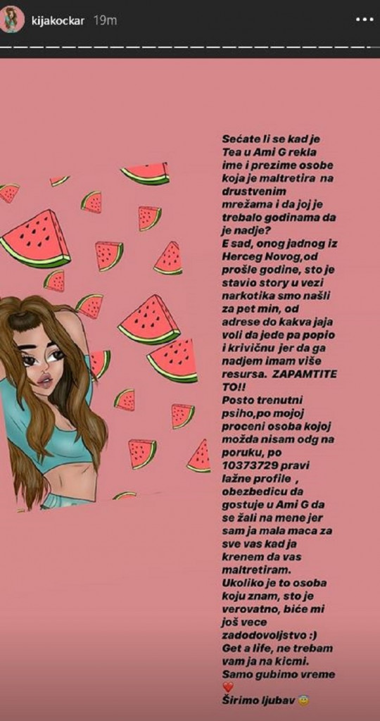 - Sećate li se kada je Tea u emisiji "Amidži šou" rekla ime i prezime osobe koja je maltretira i da joj je trebalo tri godine da je nađe? E, sad, onog jadnog iz Herceg Novog od prošle godine, što je stavio stori u vezi narkotika smo našli za pet minuta, od adrese do toga kakva jaja voli da jede, pa je popio i krivičnu jer da ga nađem imam više resursa. Zapamtite to! - poručila je Kija putem društvenih mreža.