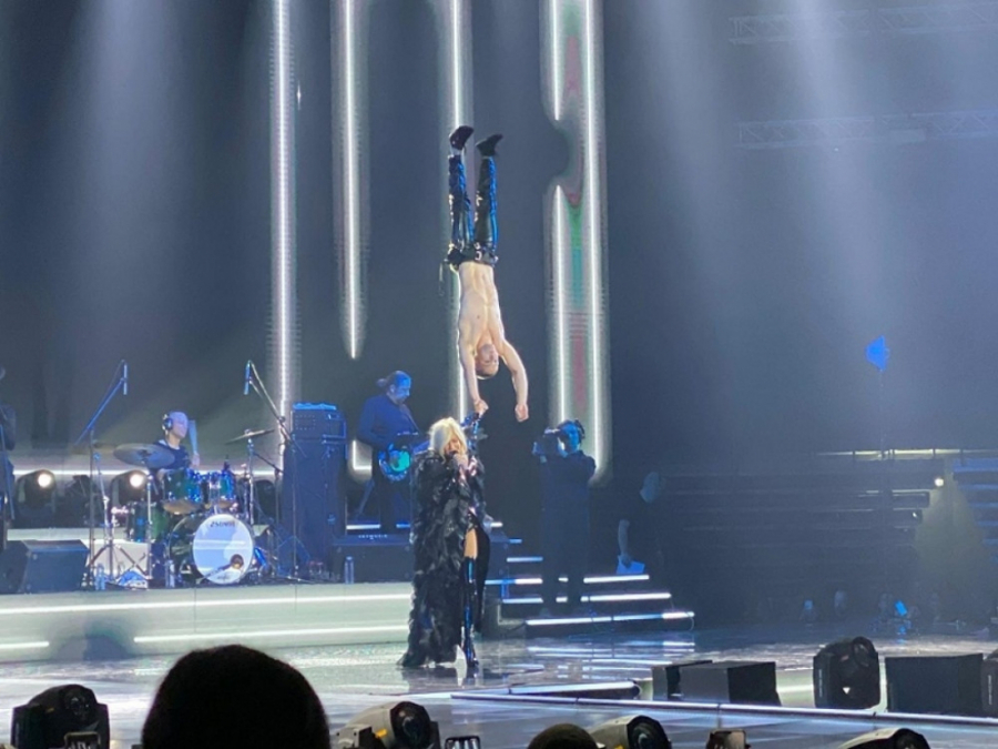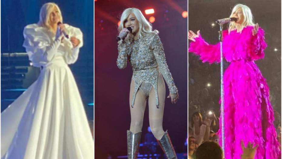Koncert je otpočela u srebrnom svetlucavom bodiju, kasnije je obukla venčanicu, potom skroz crn kožni kostim, ali i dugu haljinu od pink perja.