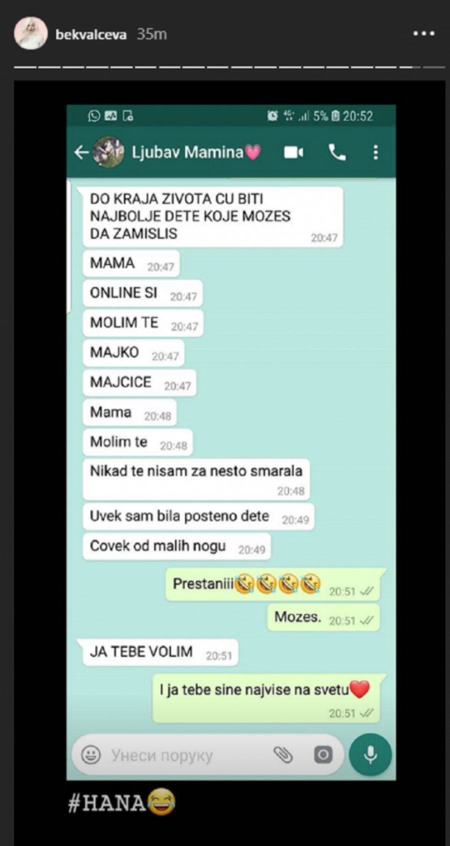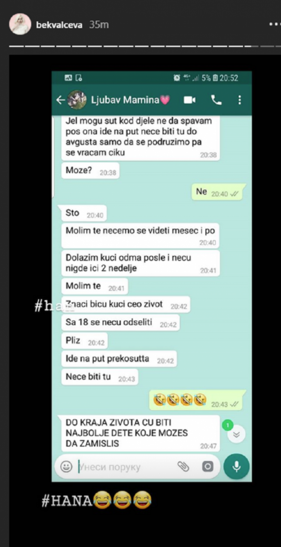 Nataša Bekvalac je otvoreno objavila dopisivanje sa svojom ćerkom Hanom na društvenim mrežama. Naime, ona ju je zamolila da prespava kod drugarice, što joj je, na prvu loptu, Nataša zabranila.