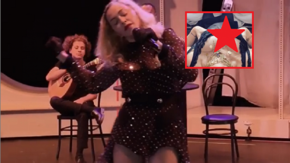 Pevačica je na sebi imala crnu čipkastu spavaćicu i ogrlice, a rukama je dodirivala svoje poprsje i slala vrele poljupce pratiocima. Madona je inače zakoračila u sedmu deceniju života, ali to je nije sprečilo da i ovoga puta ispolji svoj seksepil.
