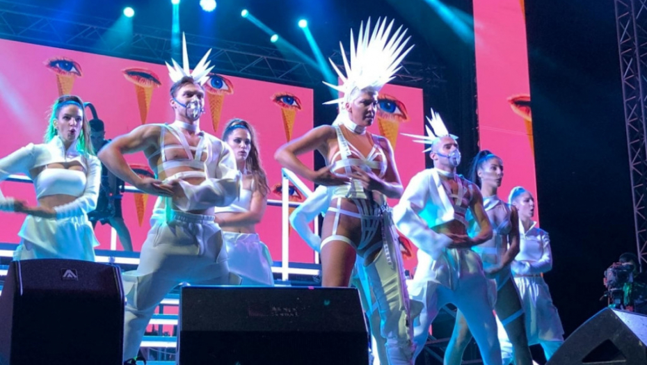 Kao što se i očekivalo od nje, kostim je bio veoma provokativan, sačinjen od belih traka. Seksepilnom garderobom jedva je prekrila intimne delove svog tela.