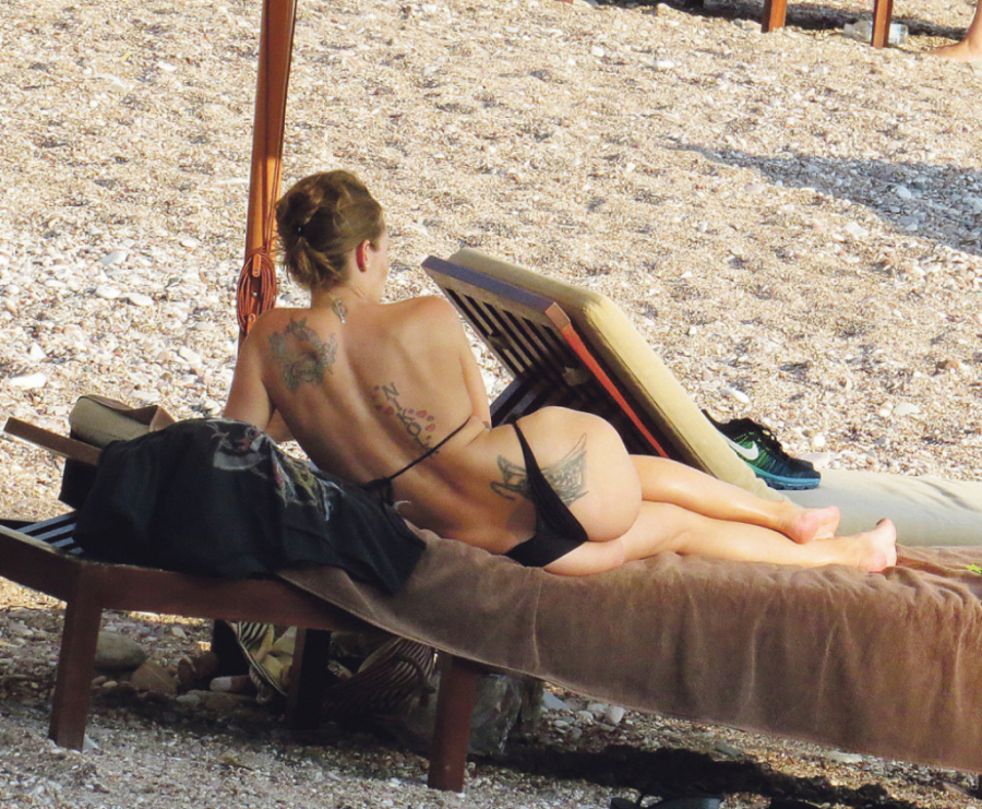 Sonja, sa druge strane, nije ulazila u morsku vodu, već se samo pokvasila ispod tuša i vratila leškarenju na ležaljki. Nikolina supruga je na sebi imala minijaturni bikini, koji je otkrio njeno vitko telo, ali i njene tetovaže.