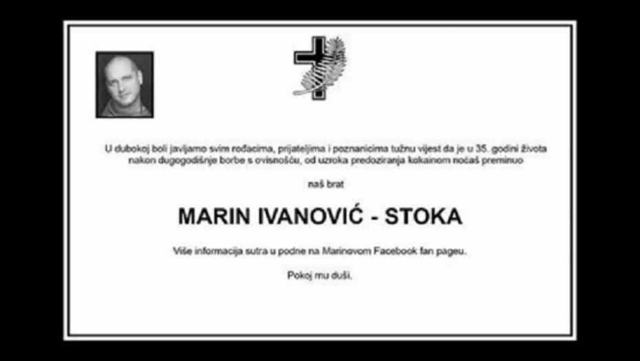 - U dubokoj boli javljamo svim rođacima, prijateljima i poznanicima tužnu vest da je u 35. godini nakon dugogodišnje borbe sa zavisnošću, od uzroka predoziranja kokainom, noćas preminuo naš brat Marin Ivanović Stoka - stoji na umrlici koja se krajem prošle nedelje pojavila na njegovoj službenoj Fejsbuk stranici, uz napomenu: “Više informacija sutra u podne”.