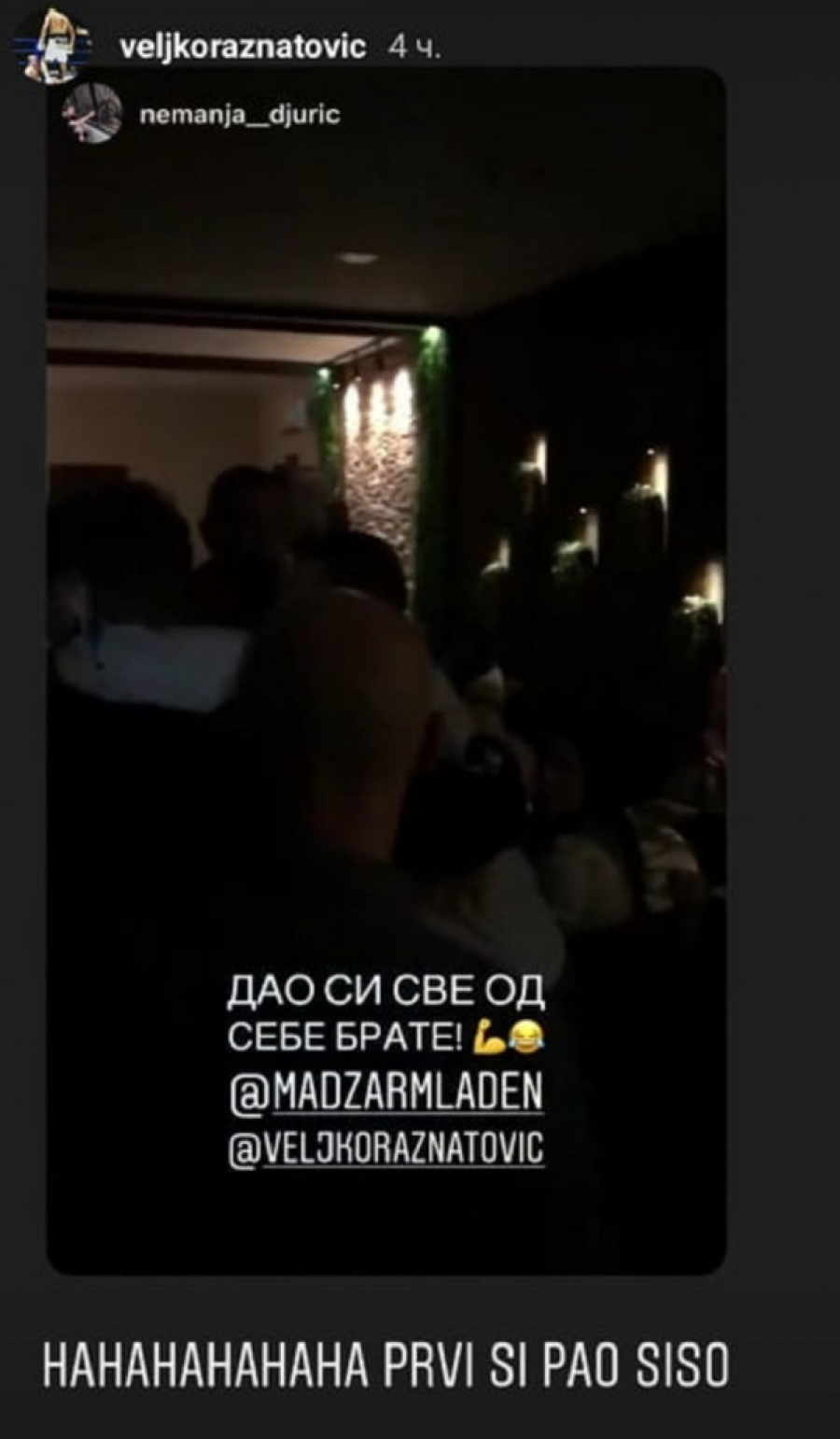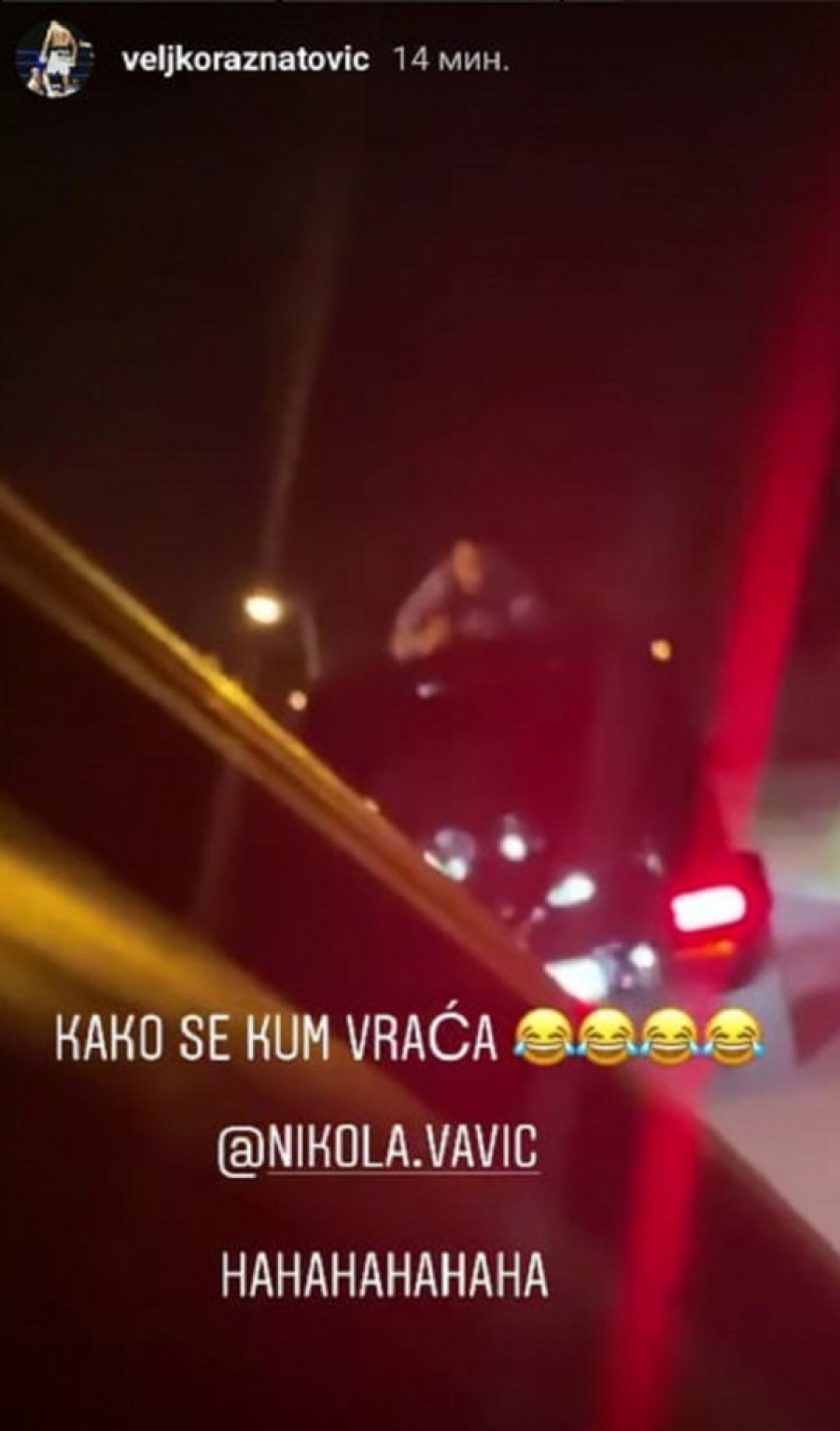 Veljko je danas objavio snimka sa žurke u Titelu, a izgleda da je tamo atmosfer bila dosta opuštenija. Naime, njegovi drugovi su toliko pili, da su neke morali da odnesu do automobila, a njegov kum Nikola Vavić je u alkoholisanom stanju, završio na krovu automobila i tako se vozio.