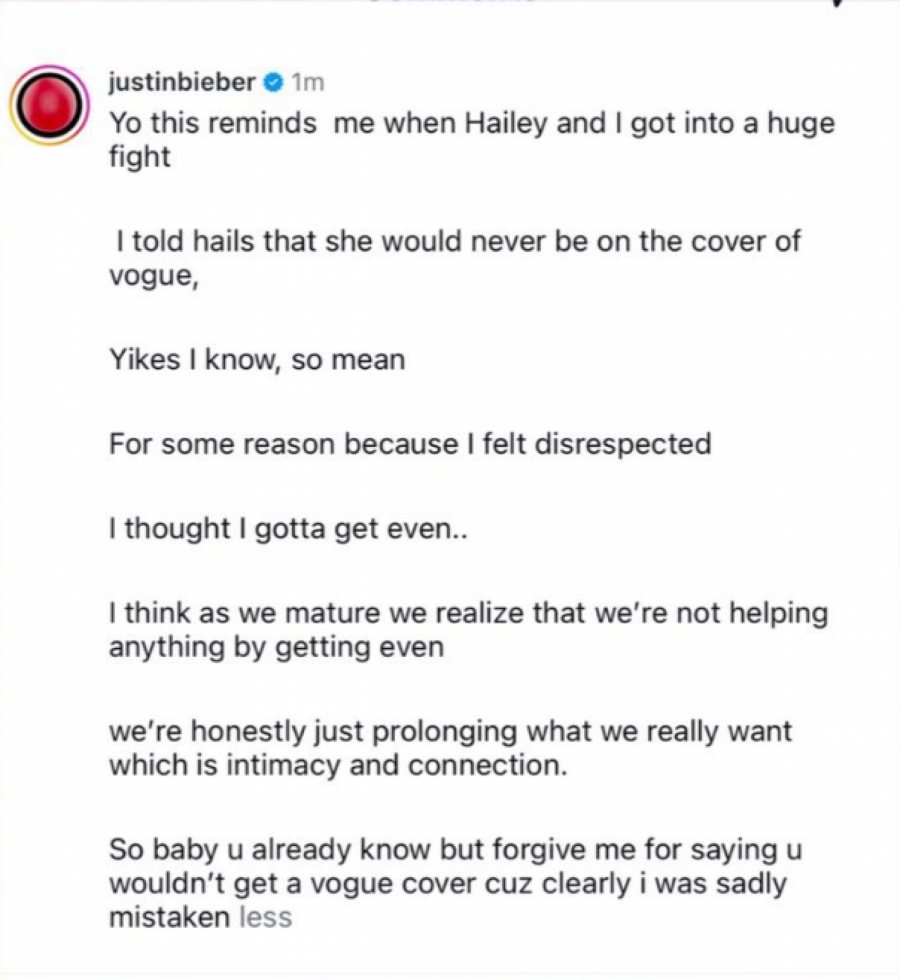 - Ovo me podseća na trenutak kad smo Hejli i ja imali veliku svađu. Rekao sam Hejls da nikad neće biti na naslovnici Vog-a. Uf, znam, baš zlobno. Iz nekog razloga, jer sam se osetio nepoštovano, mislio sam da moram da joj vratim... Mislim da kako sazrevamo shvatamo da ništa ne postižemo time što se svetimo. Iskreno, samo odlažemo ono što stvarno želimo, a to su bliskost i povezanost. Tako da, dušo, ti to već znaš, ali oprosti mi što sam rekao da nećeš dobiti naslovnicu Vog-a, jer sam očigledno i nažalost bio u velikoj zabludi - napisao je Džastin.