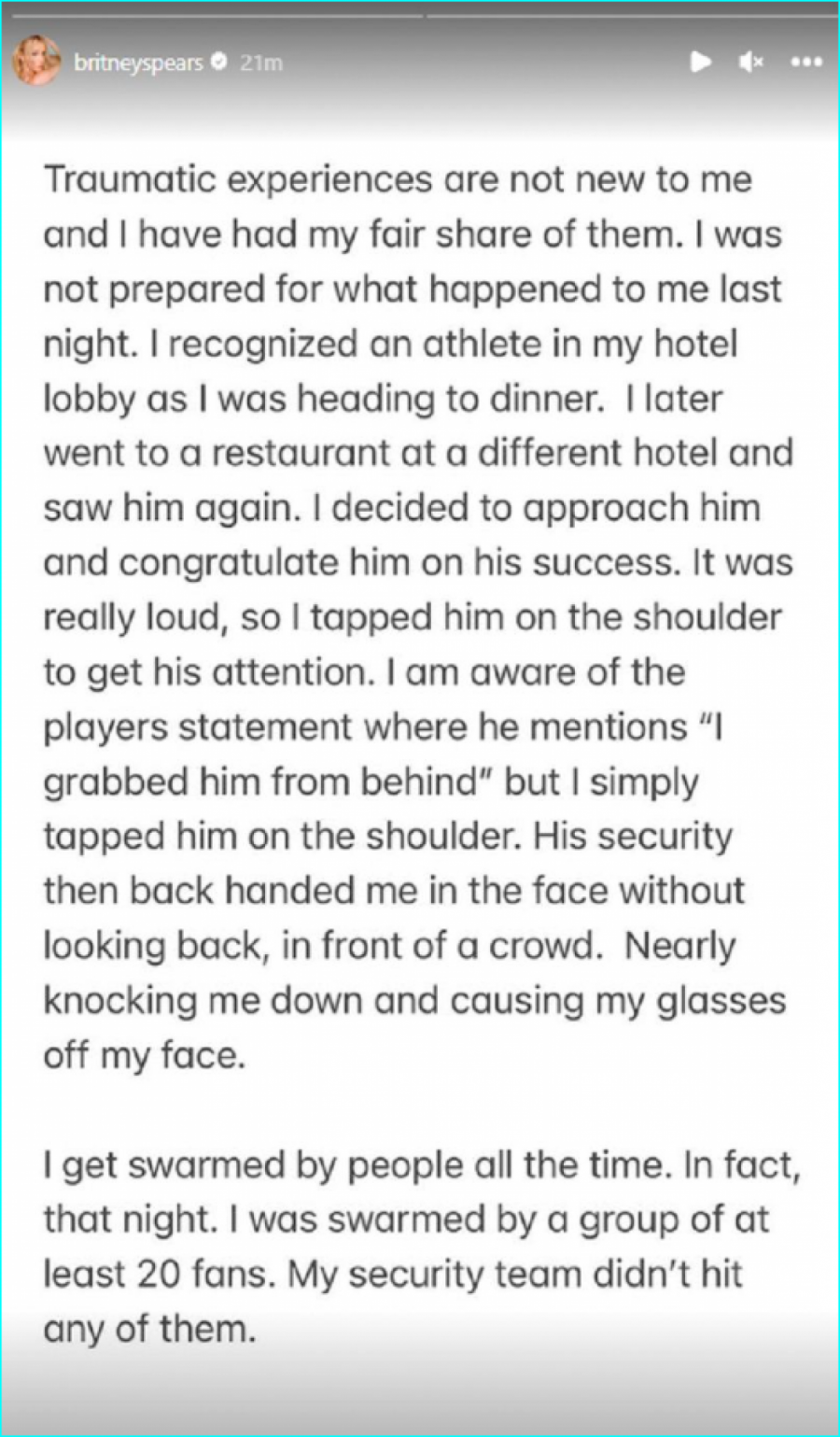 - Traumatska iskustva nisu nova za mene i imala sam ih dosta do sada. Nisam bila spremna za ono što mi se sinoć dogodilo. Prepoznala sam sportistu u holu hotela dok sam išla na večeru. Kasnije sam otišla u restoran u drugom hotelu i ponovo ga videla. Odlučila sam da mu priđem i da mu čestitam na uspehu. Bilo je jako glasno, pa sam ga kucnula po ramenu da privučem njegovu pažnju. Znam za izjavu u kojoj pominje da sam ga "uhvatila za njega", ali sam ga jednostavno tapkala po ramenu. Njegovo obezbeđenje me je tada uradilo u lice ne osvrćući se, pred gomilom. Umalo da me obori i skine mi naočare sa lica. Stalno me obleću ljudi. Moj tim obezbeđenja nikada nije udario nijednog od njih. Ovu priču je veoma neprijatno podelili sa svetom, ali je već tu. Ipak, mislim da je važno da podelimo ovu priču i da apelujemo na ljude u očima javnosti da daju primer da se prema ljudima odnose sa poštovanjem. Previše se dešava fizičko nasilje u ovom svetu. Često iza zatvorenih vrata. Stojim uz sve žrtve i srce mi je za sve vas!!! Još nisam dobila javno izvinjenje od igrača, njegovog obezbeđenja ili njihove organizacije. Nadam se da ću dobiti... Cenim ogromnu količinu ljubavi i podrške koju dobijam u ovom trenutku. Hvala policijskoj upravi Las Vegasa i detektiva na podršci. Takođe bih veoma i cenila da se nisu smejali u tom trenutku. Gledajući njega kako se smeje na zao način i u toj situaciji gde sam ja visoka 1.61, a on je visok 2.25 - napisala je Britni na svom Instagramu.