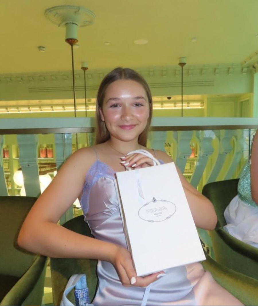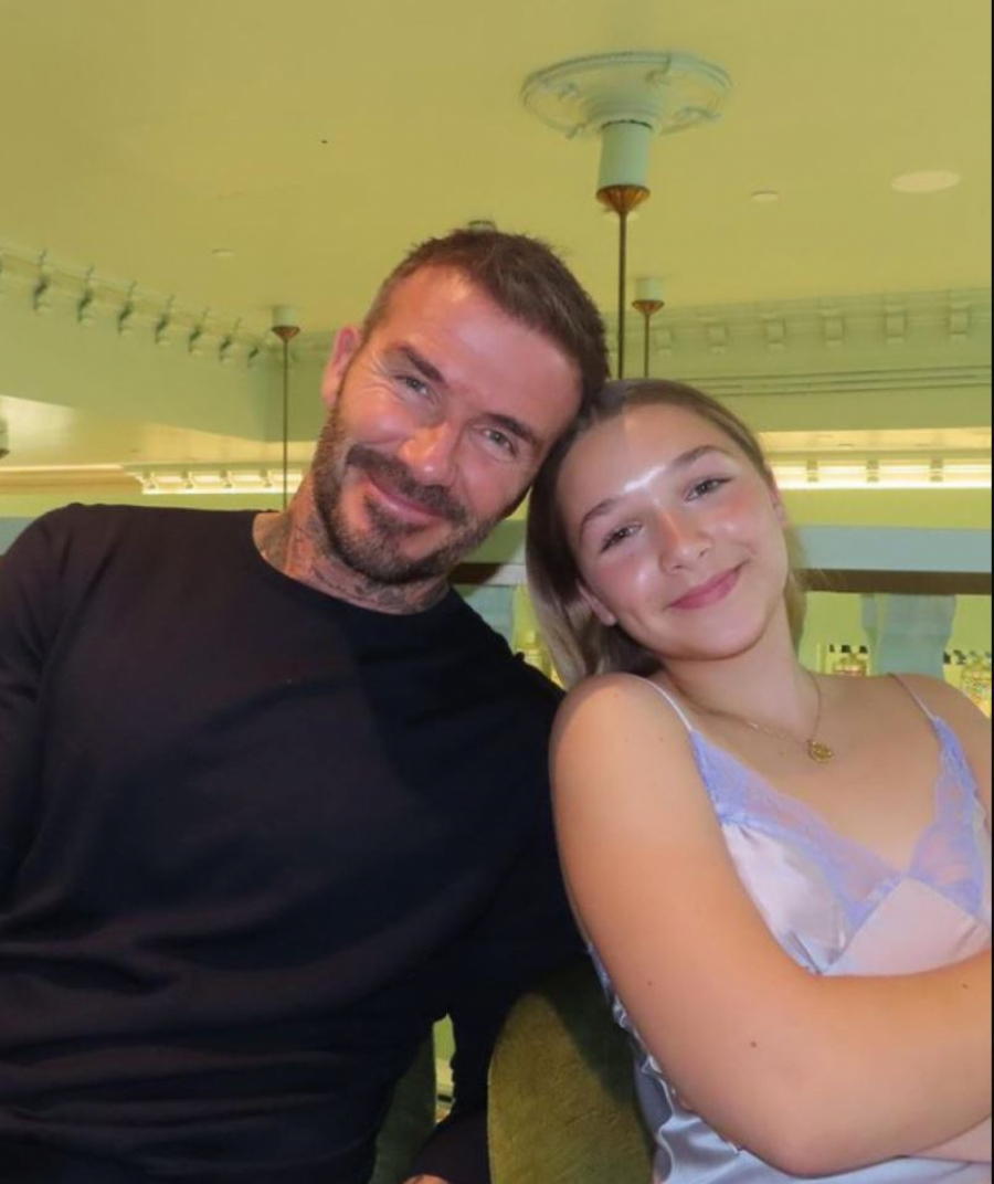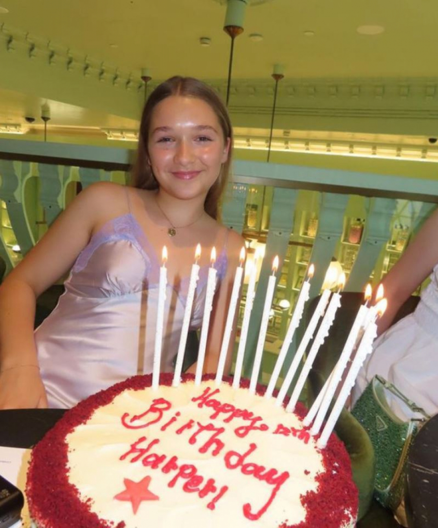 Harper je za ovu priliku obukla lila satensku haljinu, a porodica se okupila kako bi ručali u otmenom restranu brenda u Harodsu. Ćerka Bekamovih ponela je uz haljinu i Pradinu torbicu, čija se vrednost procenjuje na 2.500 evra, a dobila ju je od roditelja kao rođendanski poklon.