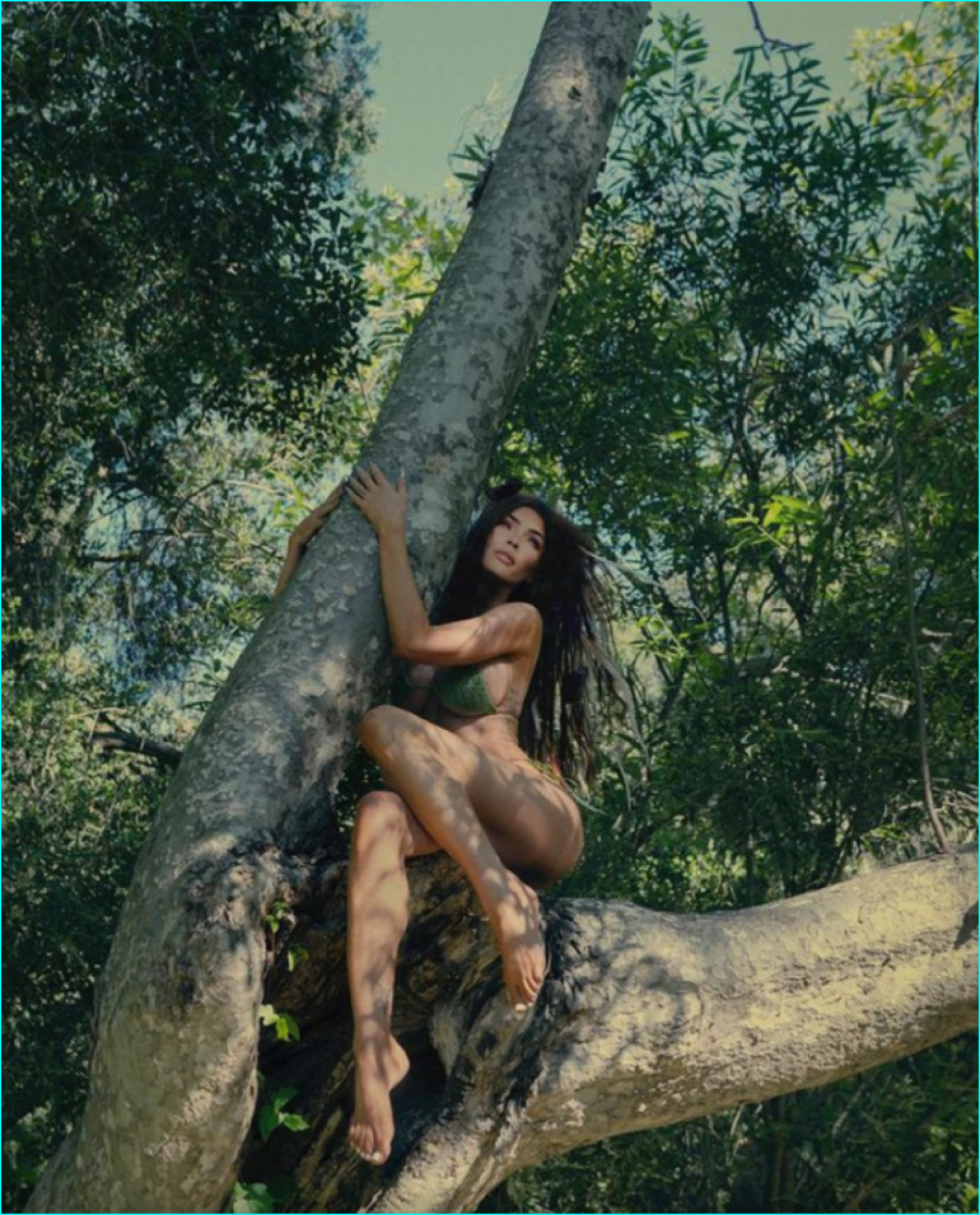 Na jednoj fotografiji Megan grli drvo dok sedi na drugoj grani i gleda u divljinu, dok joj se kosa viori na vetru.