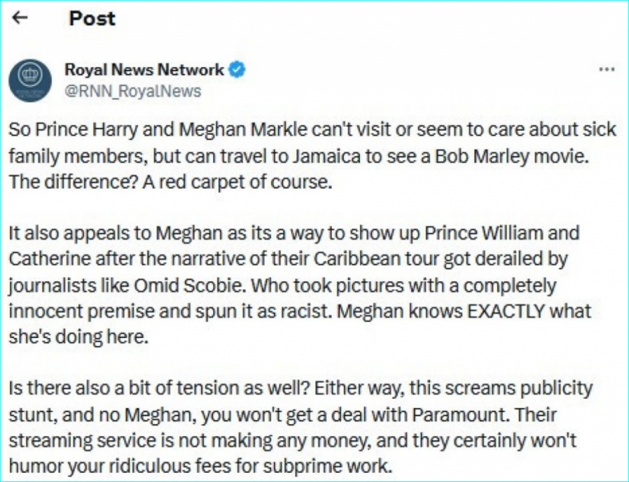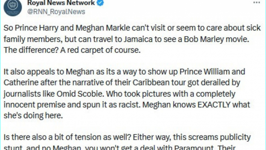 - Problem je što svuda idu na crveni tepih, a porodicu nikad ne posećuju. Njima je lakše nego kraljevskoj porodici, jer koji bi narod plaćao njihov put? Više ima smisla da Megan i Hari odu... Ali oni to nikada ne rade - tvrdi drugi korisnik mreže „X".
