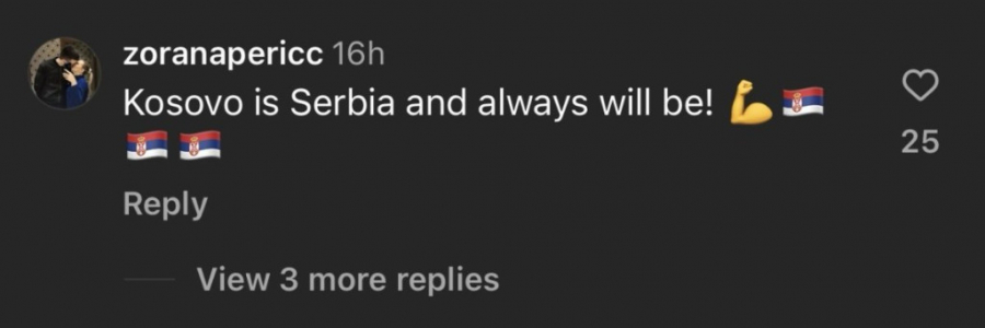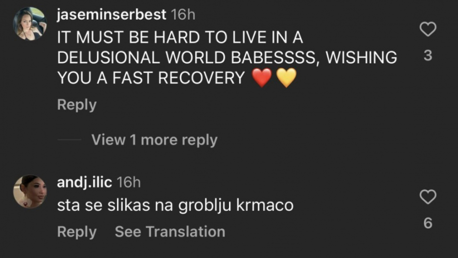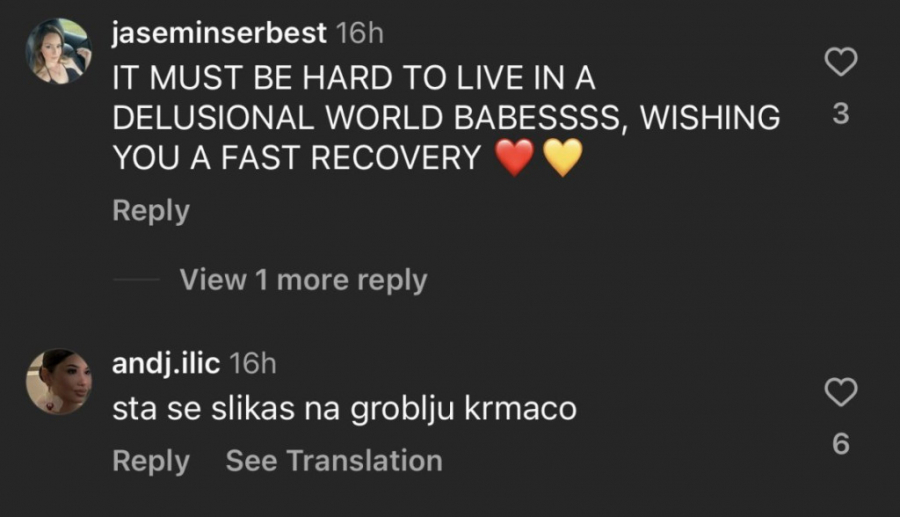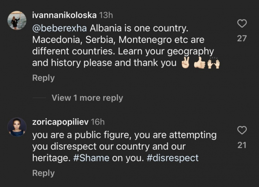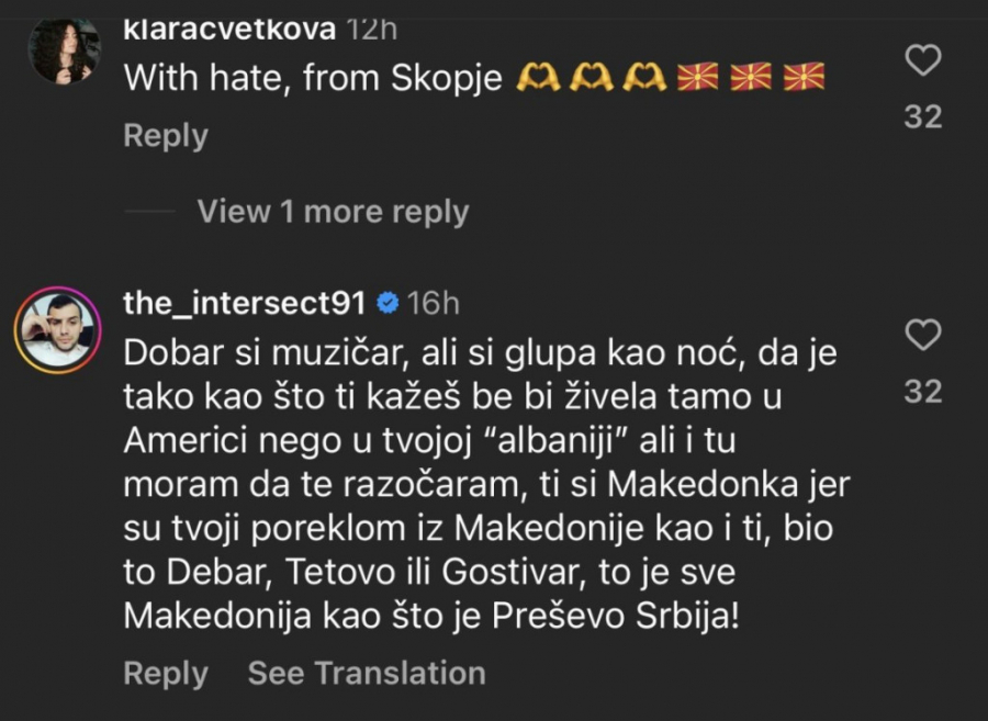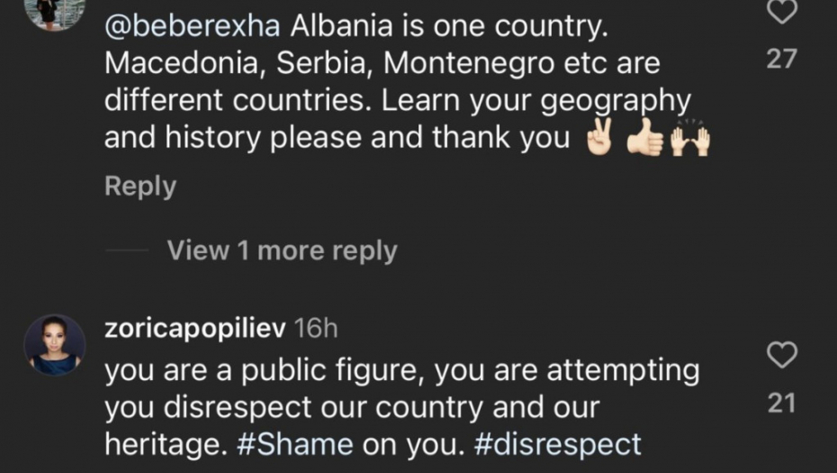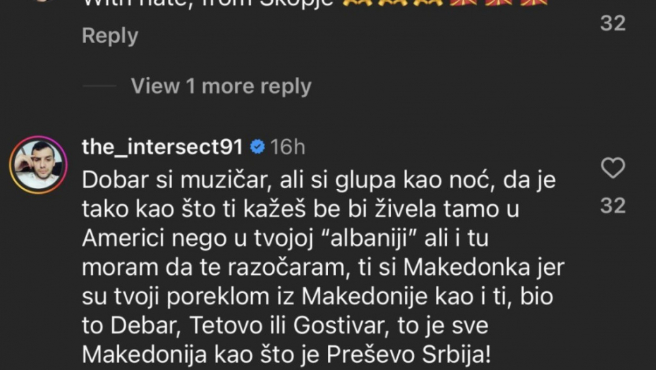 - "Albanija je jedna zemlja, Makedonija, Srbija i Crna Gora su sasvim druge države. Nauči geografiju i istoriju molim te", "Ti si javna ličnost i pokušavaš da nipodaštavaš našu zemlju i nasleđe, srami se!", "Izvinite braćo Makedonci, sad vidite kako je nama sa ovim šljamom. Dno", "Glupa si kao noć. Moram da te razočaram. I ti si Makedonka jer su tvoji poreklom iz Makedonije bio to Debar, Tetovo ili Gostivar, to je sve Makedonija, kao što je i Preševo Srbija", "Kosovo je Srbija i uvek će biti", "Deda ti se u grobu prevrće", "Šta se slikaš na grobu krmačo?!", "Pozivaš na rat, smeće jedno!" - samo su neki od komentara ispod njenih fotografija.
