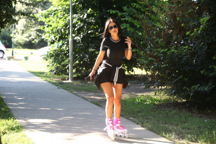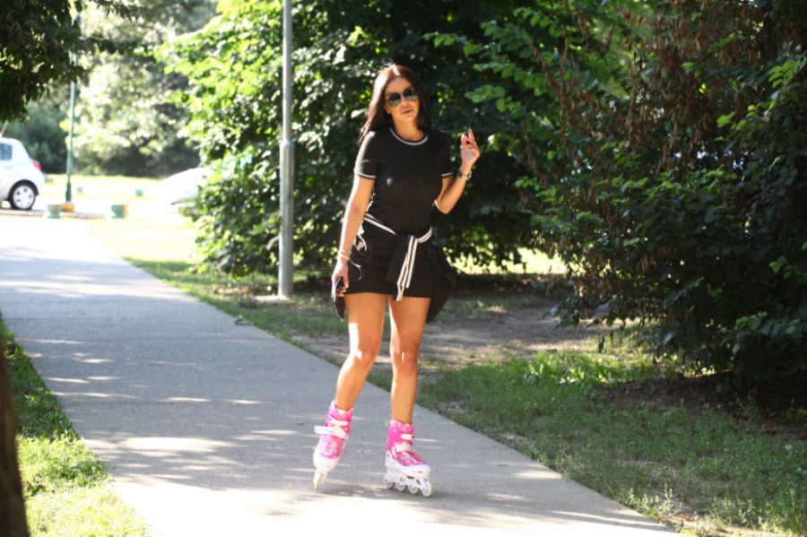 Seksi Jeca je za vreli letnji dan odabrala crnu mini haljinu, kojom je istakla svoje obline i tanak struk, a duge noge sunčala je zatežući mišiće na točkićima.