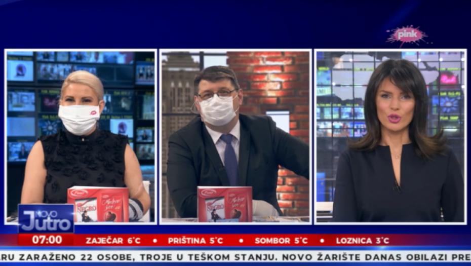 Ona već nekoliko dana u jutarnjem programu nosi masku, a jutros je dobila posebnu sa logom televizije "Pink". Ovom maskom je pokazala da ona i njena televizija veoma vode računa o zaštiti od koronavirusa i trude se da utiču na javnost da shvati ozbiljnost situacije u kojoj se svi nalazimo.