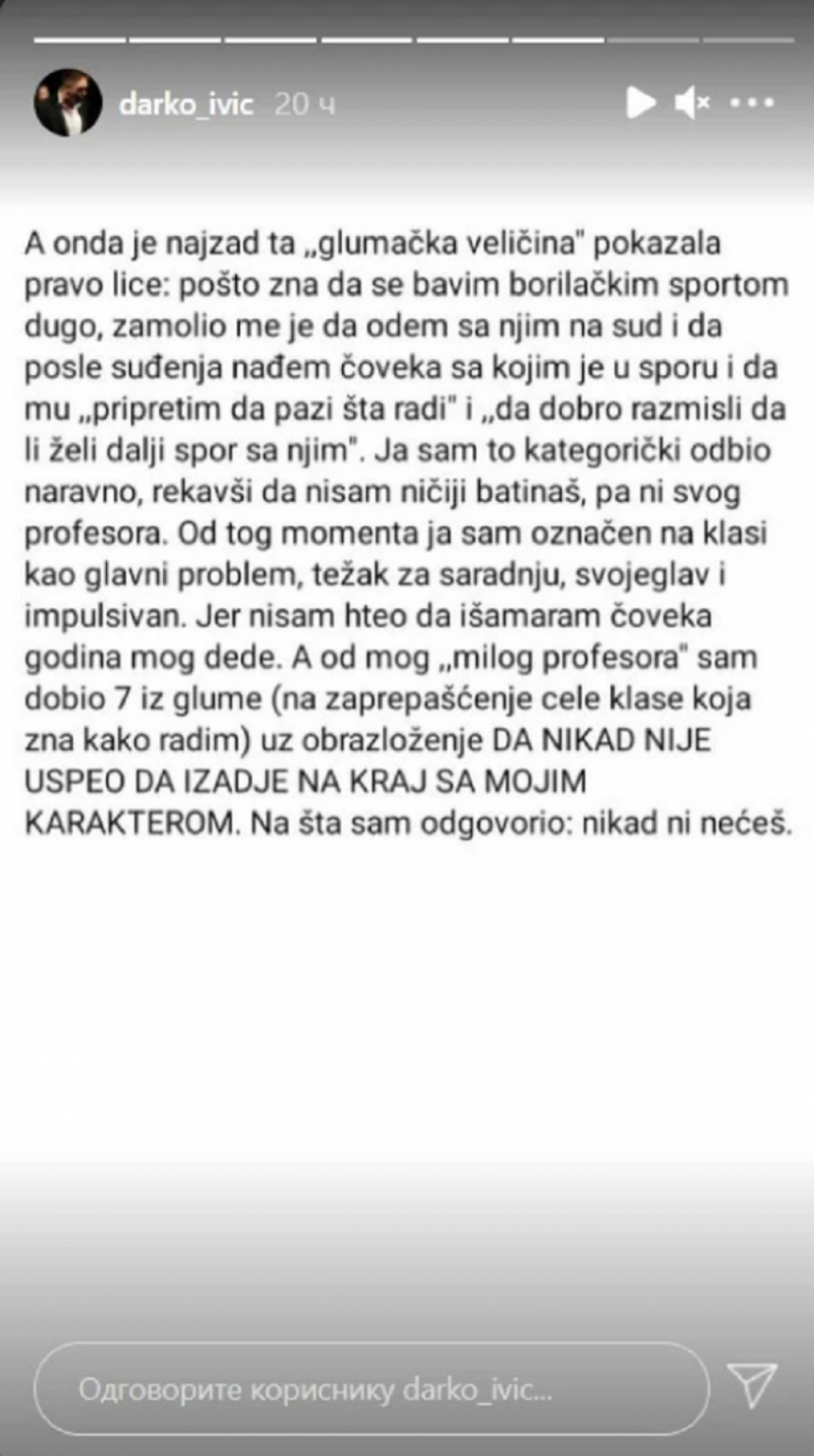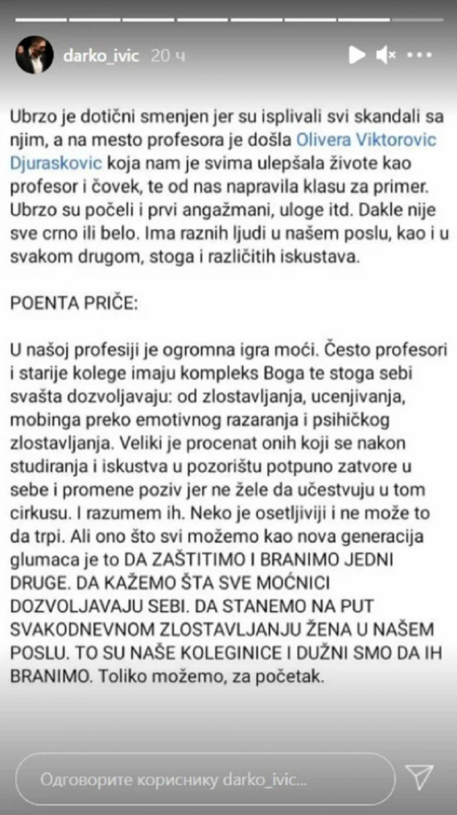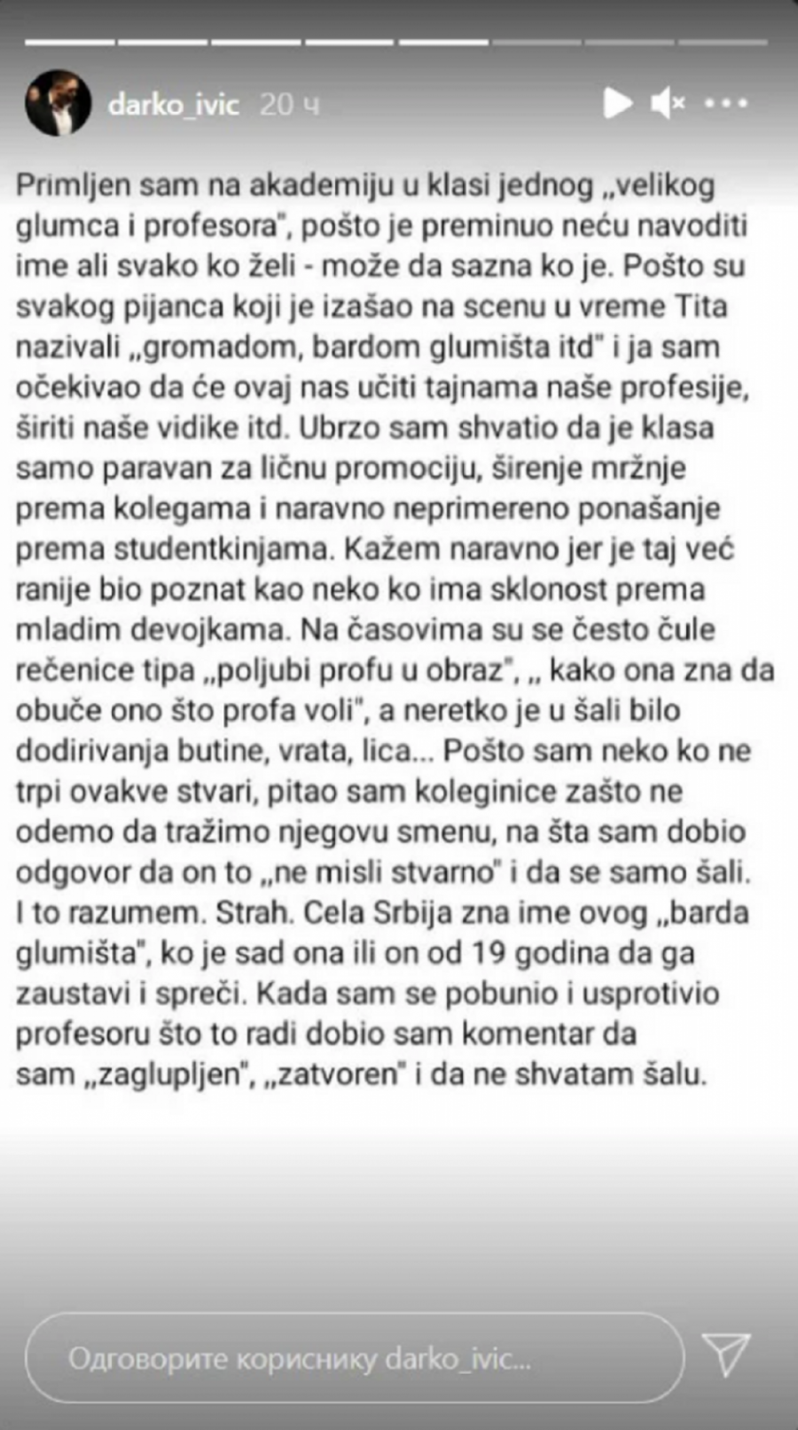 - Primljen sam na akademiju u klasi jednog ,’velikog glumca i profesora’, pošto je preminuo neću navoditi ime ali svako ko želi – može da sazna ko je. Pošto su svakog pijanca koji je izašao na scenu u vreme Tita nazivali ,’gromadom, bardom glumišta’ itd. i ja sam očekivao da će ovaj nas učiti tajnama naše profesije, širiti naše vidike itd. Ubrzo sam shvatio da je klasa samo paravan za ličnu promociju, širenje mržnje prema kolegama i naravno neprimereno ponašanje prema studentkinjama. Kažem naravno jer je taj već ranije bio poznat kao neko ko ima sklonost prema mladim devojkama. Na časovima su se često čule rečenice tipa ‘poljubi profu u obraz’, ‘kako ona zna da obuče ono što profa voli’, a neretko je u šali bilo dodirivanja butine, vrata, lica… Pošto sam neko ko ne trpi ovakve stvari, pitao sam koleginice zašto ne odemo da tražimo njegovu smenu, na šta sam dobio odgovor da on to ‘ne misli stvarno’ i da se samo šali. I to razumem. Strah. Cela Srbija zna ime ovog ‘barda glumišta’, ko je sad ona ili on od 19 godina da ga zaustavi i spreči. Kada sam se pobunio i usprotivio profesoru što to radi dobio sam komentar da sam ‘zaglupljen’, ‘zatvoren’ i da ne shvatam šalu - počeo je svoju ispovest mladi glumac.