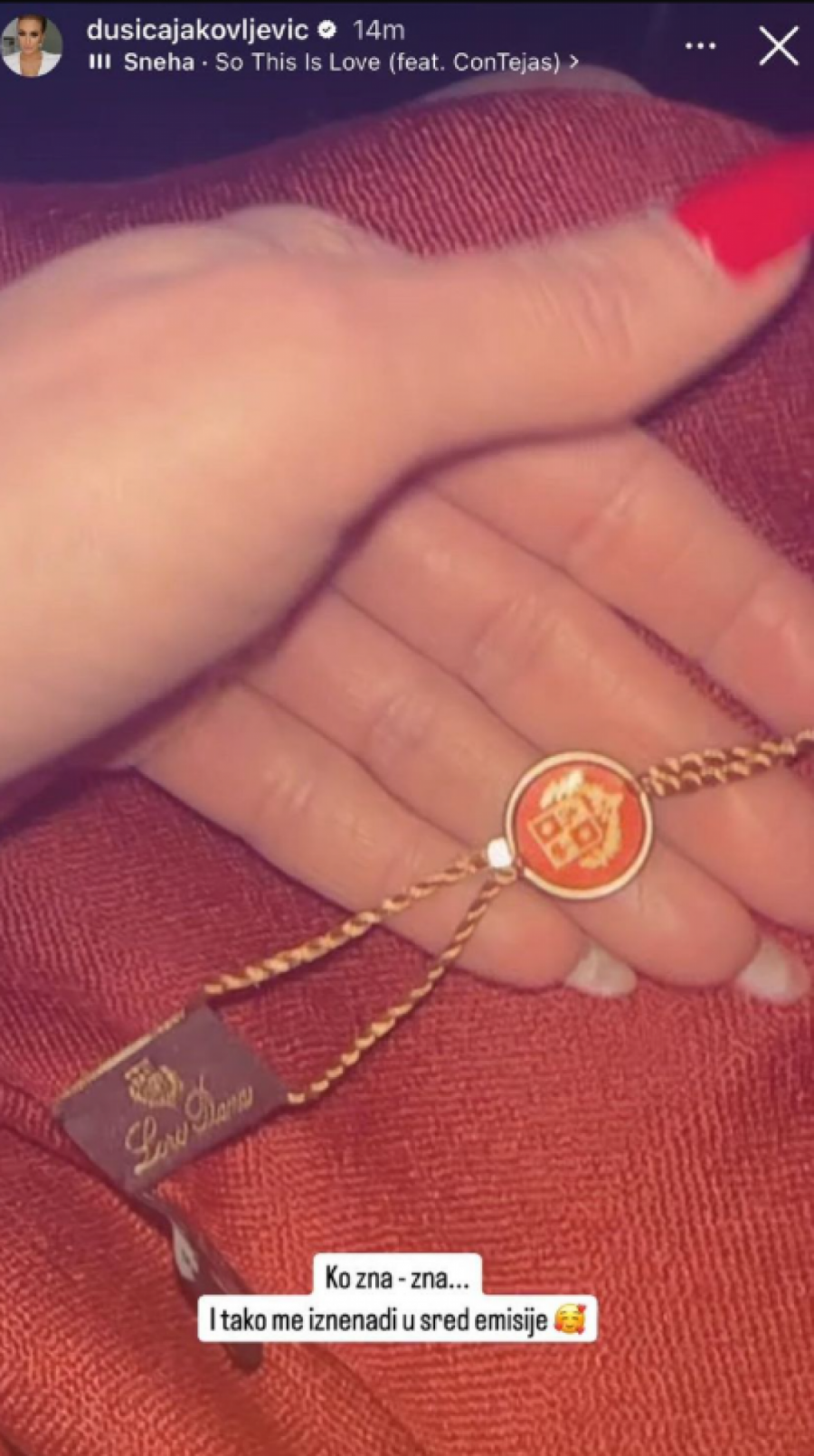 - Ko zna - zna. I tako me iznenadi usred emisije... - napisala je Dušica Jakovljević koja je pokazala poklon, a mnogi misle da joj je to priredio njen partner.