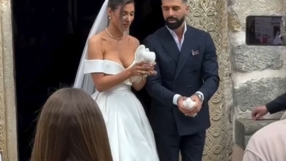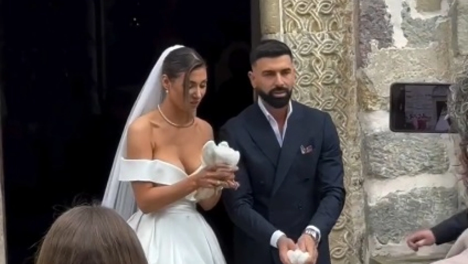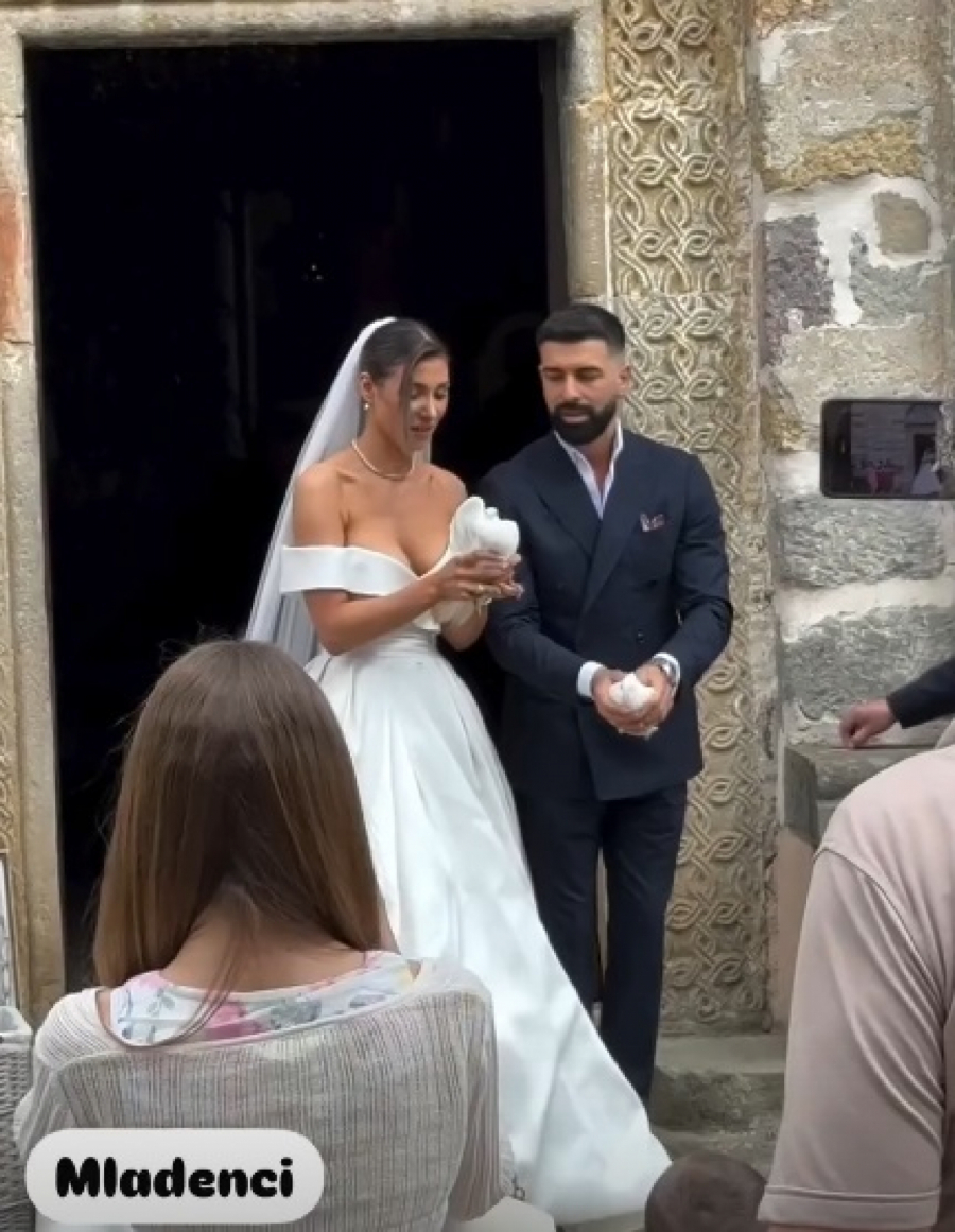 Andrijana je blistala u venčanici sa izraženim dekolteom i otvorenim ramenima, dok se Miloš odlučio za tamnoteget odelo i belu košulju.