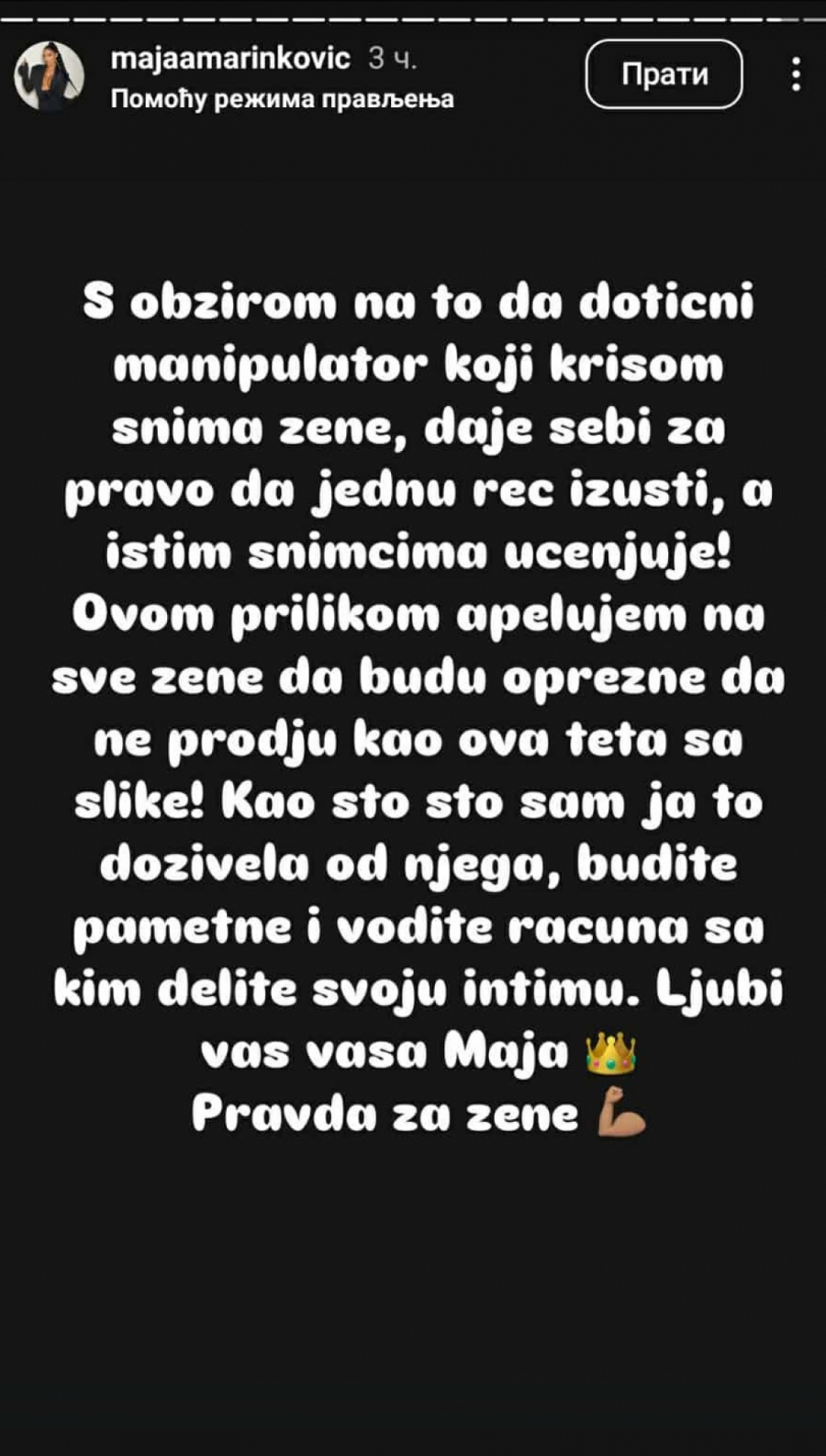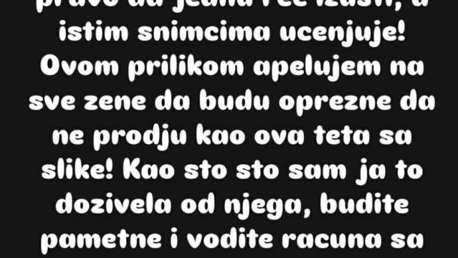 - S obzirom na to da dotični manipulator koji krišom snima žene, daje sebi za pravo da jednu reč izusti, a istim snimcima ucenjuje! Ovom prilikom apelujem na sve žene da budu oprezne. Budite pametne i vodite računa sa kim delite svoju intimu. Ljubi vas vaša Maja i pravda za žene - zaključila je Maja Marinković.