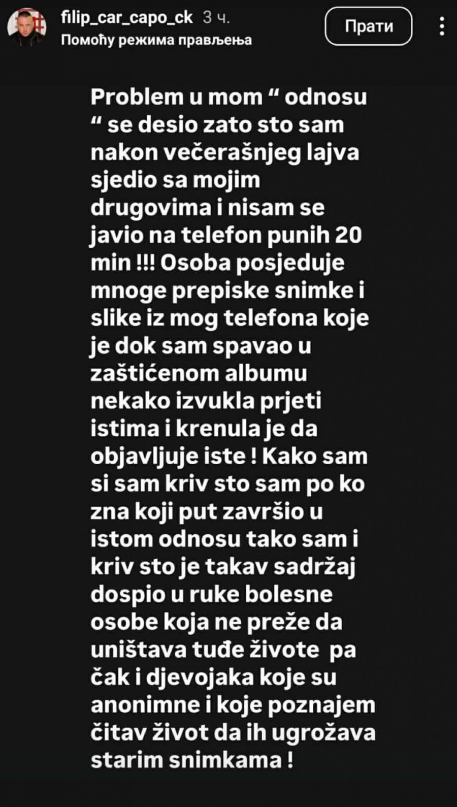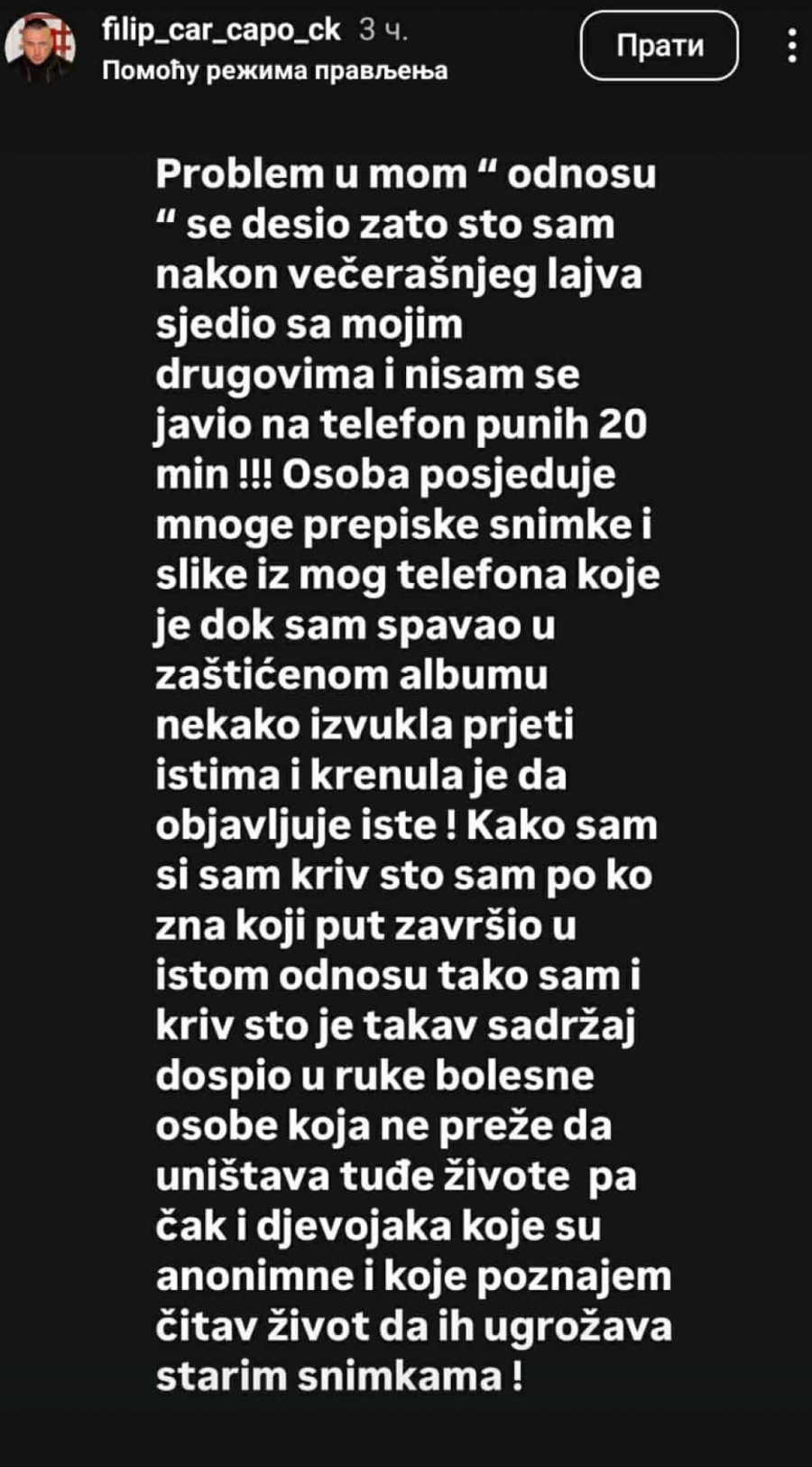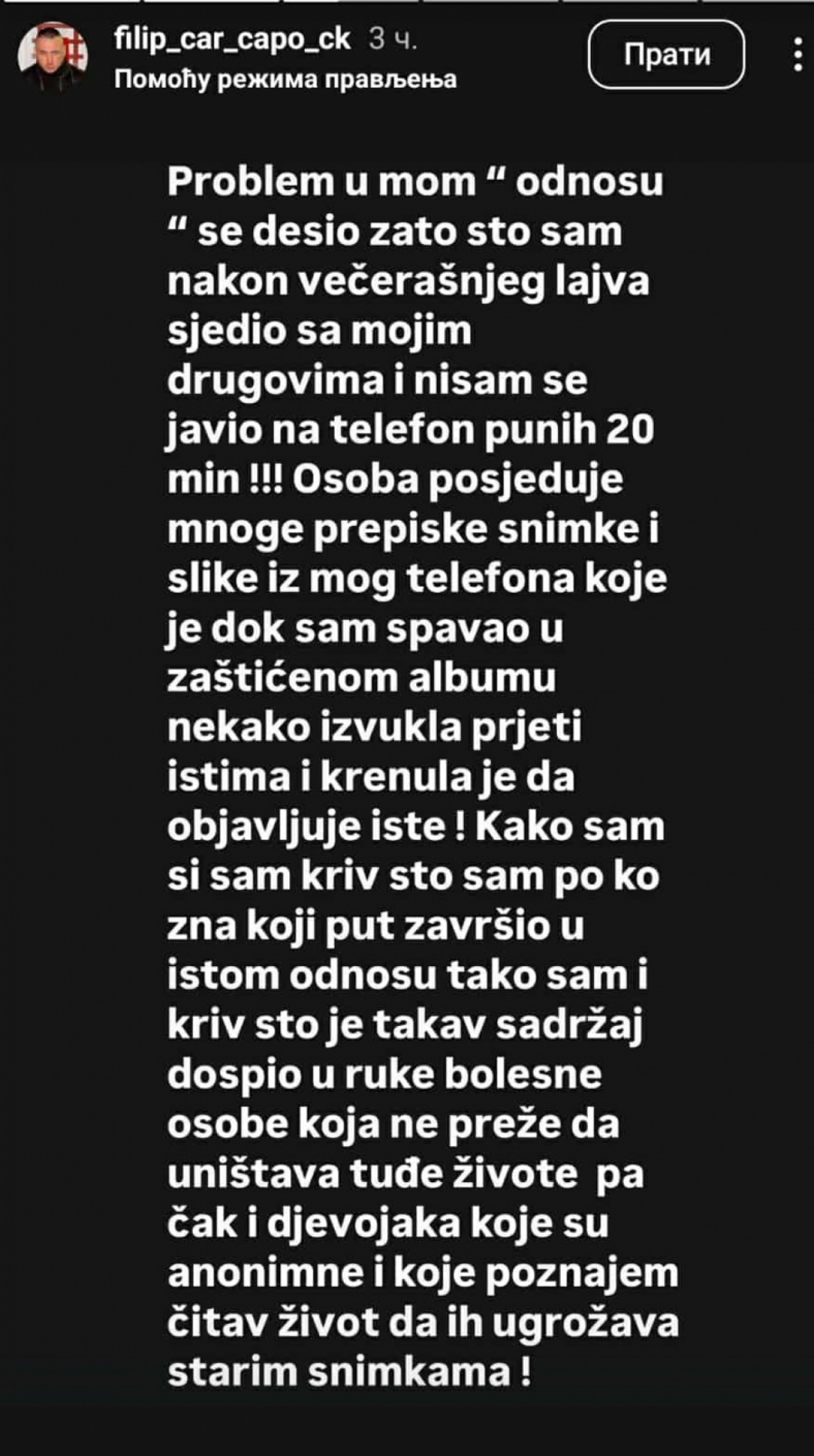 - Problem u mom "odnosu" se desio zato što sam nakon večerašnjeg lajva sedeo sa mojim drugovima i nisam se javio na telefon punih 20 minuta. Osoba (Maja Marinković) poseduje mnoge prepiske, snimke i slike iz mog telefona koje je dok sam spavao u zaštićenom albumu, nekako izvukla, a sada preti istim i krenula je da objavljuje iste! Kako sam I sam kriv Što sam po ko zna koji put završio u istom odnosu, tako sam i kriv što je takav sadržaj dospeo u ruke bolesne osobe, koja ne preza da uništava tuđe živote, pa čak i devojaka koje su anonimne i koje poznajem čitav život da ih ugrožava starim snimcima - objasnio je Filip Car.
