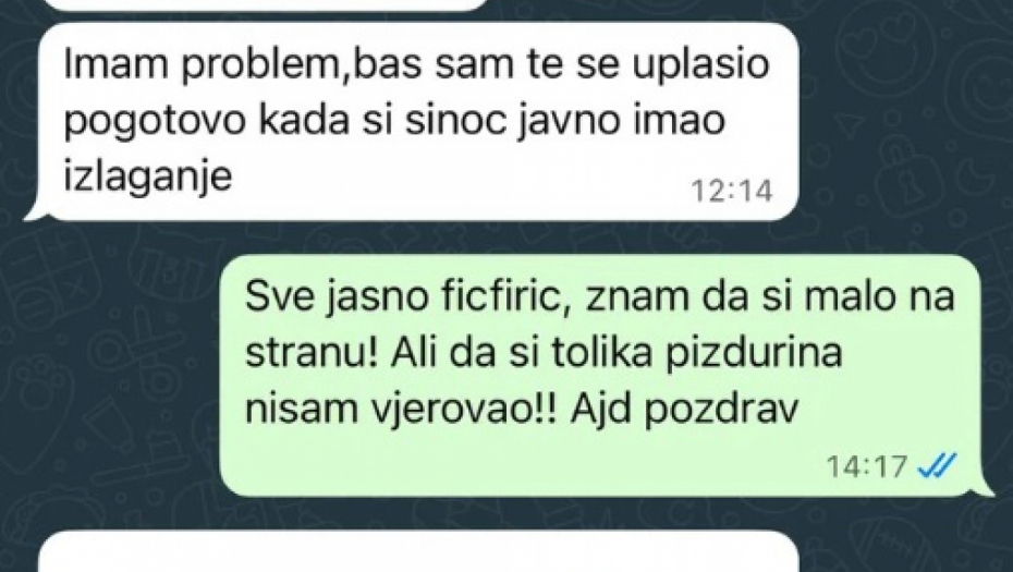 - Samo polako, strpljen, spašen. Ovo je moja poslednja poruka tebi. Ti si mangup, ozbiljan kriminalac,  takve baš volim. Polako, pa ćemo da vidimo kome si majku uzimao u usta, koga si sve vređao. Baš si 'mangup', ali doći će maca na vratanca, sve u svoje vreme. Sada sedi na svoj vibrator i, uživaj - bio je brutalan Vujović.