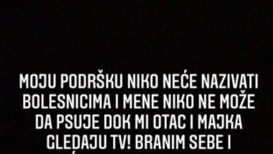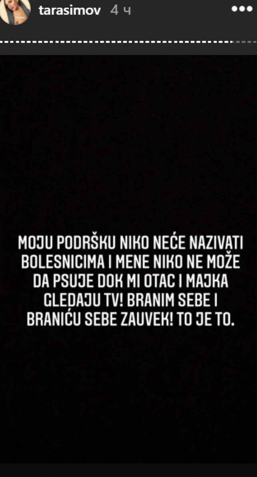 - Moju podršku niko neće nazivati ''bolesnicima'' i mene niko ne može da psuje, dok mi otac i majka gledaju TV! Branim sebe i braniću sebe zauvek! To je to - poručila je Tara.