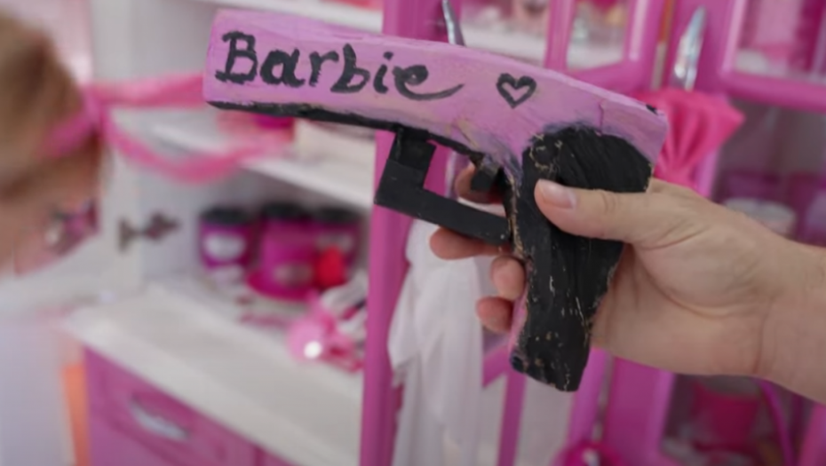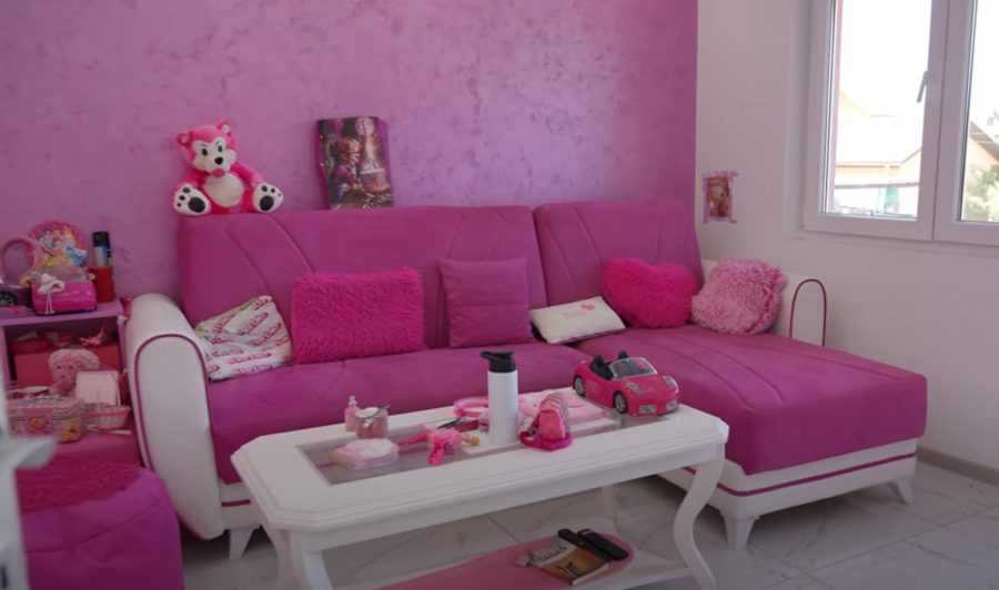 U jednom kutku dnevne sobe posebno se ističe pink vitrina, prepuna sitnica u njenom omiljenom stilu – barbi detalja, šarenih uspomena i dekoracija koje prate njen prepoznatljiv imidž. Ipak, među svim tim roze nijansama posebno pažnju privlači nesvakidašnji predmet: drveni pištolj koji joj je, kako otkriva, isklesao Kristijan Golubović tokom njihovog boravka na Farmi 8. Taj neobični poklon danas zauzima počasno mesto u vitrini, kao podsećanje na jedno poglavlje njenog rijaliti iskustva.