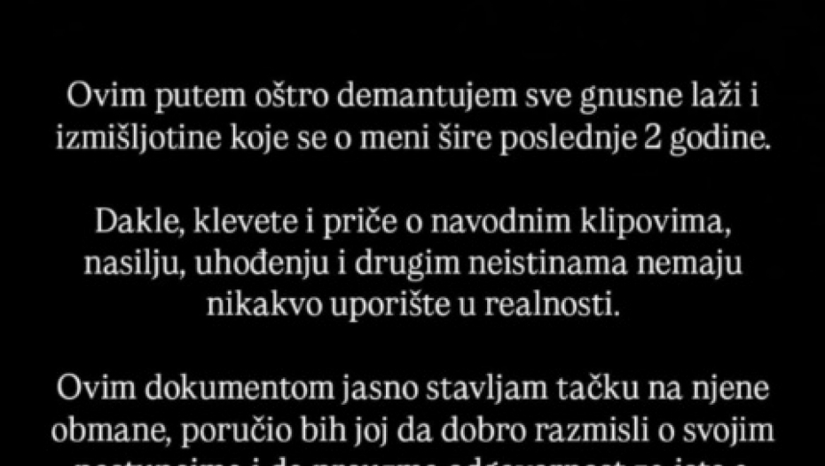 - Ovim putem oštro demantujem sve gnusne laži i izmišljotine koje se o meni šire poslednje dve godine. Dakle, klevete i priče o navodnim klipovima, nasilju, uhođenju i drugim neistinama nemaju nikakvo uporište u realnosti. Ovim dokumentom jasno stavljam tačku na njihove obmane. Poručio bih joj da dobro razmisli o svojim postupcima i da preuzme odgovornost za iste, a meni nek se skine sa grbače zajedno sa njenim fanovima - napisao je Zvezdan, misleći na Anđelu Đuričić, i dodao: