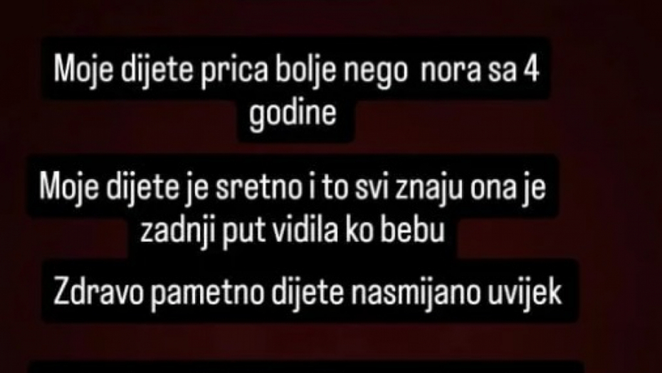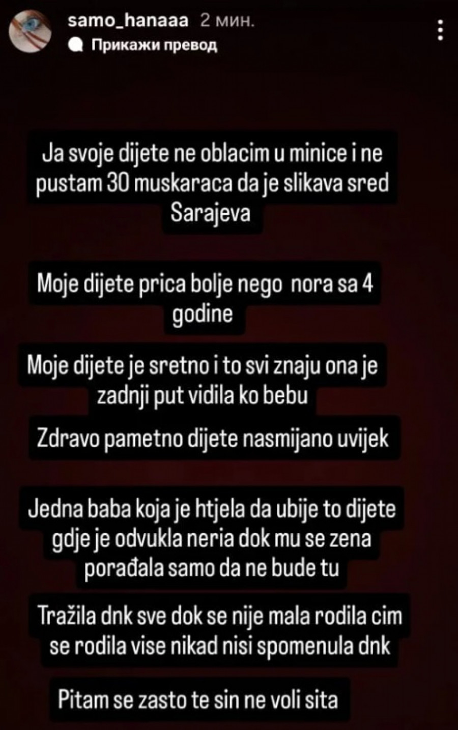 – Svoje dete ne oblačim u minice i ne puštam 30 muškaraca da je slikaju nasred Sarajeva. Moje dete priča bolje nego Nora sa četiri godine. Moje dete je srećno i to svi znaju. Poslednji put je videla bebu kada se rodila. Zdravo, pametno i nasmejano dete… Jedna žena koja je želela da naudi tom detetu odvukla je Nerija dok se žena porađala, samo da ne bude tu, tražila DNK test sve dok se dete nije rodilo, a čim se rodilo više nikada nije pomenula isti. Pitam se zašto te sin ne voli, Sita – napisala je Hana na Instagramu.
