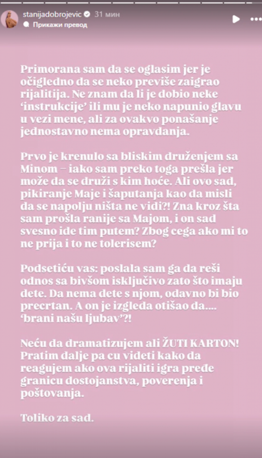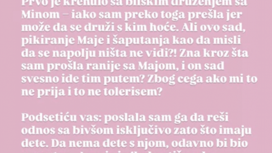 - Prvo je krenulo sa bliskim druženjem sa Minom, iako sam preko toga prešla jer može da se druži sa kim hoće. Ali ovo sad pikiranje Maje i šaputanja kao da misli da se napolju ništa ne vidi? Zna kroz šta sam prošla ranije sa Majom, i on sad svesno ide tim putem? Zbog čega ako mi to ne prija i to ne tolerišem? Podsetiću vas, poslala sam ga da reši odnos sa bivšom isključivo zato što imaju dete. Da nema dete s njom, odavno bi bio precrtan. A on je izgleda otišao da... "brani našu ljubav"?! Neću da dramatizujem , ali žuti karton! Pratim dalje pa ću videti kako da reagujem, ako ova rijaliti igra pređe granicu, dostojanstva, poverenja i poštovanja. Toliko za sad - poručila je bivša Dobrojevićeva.