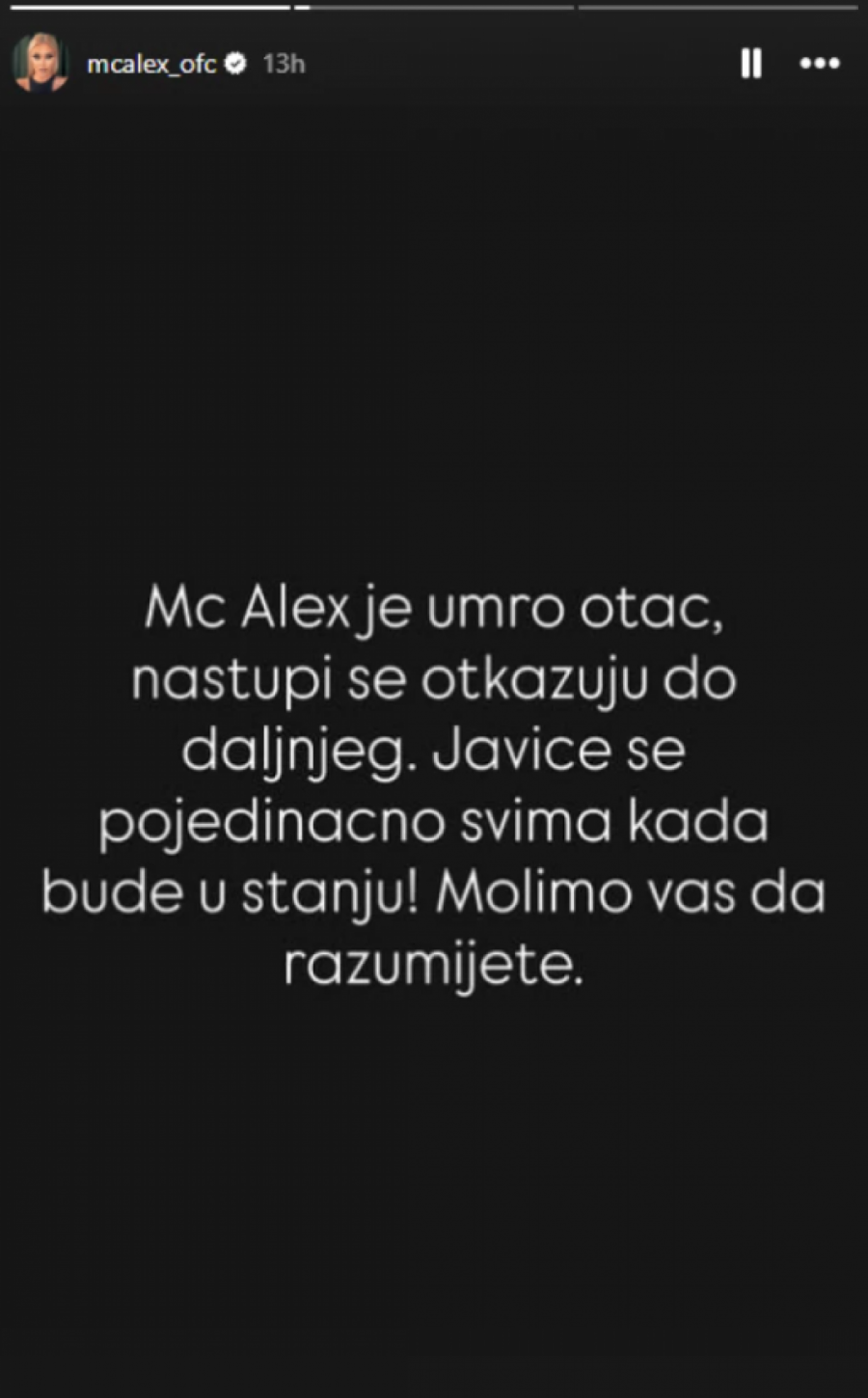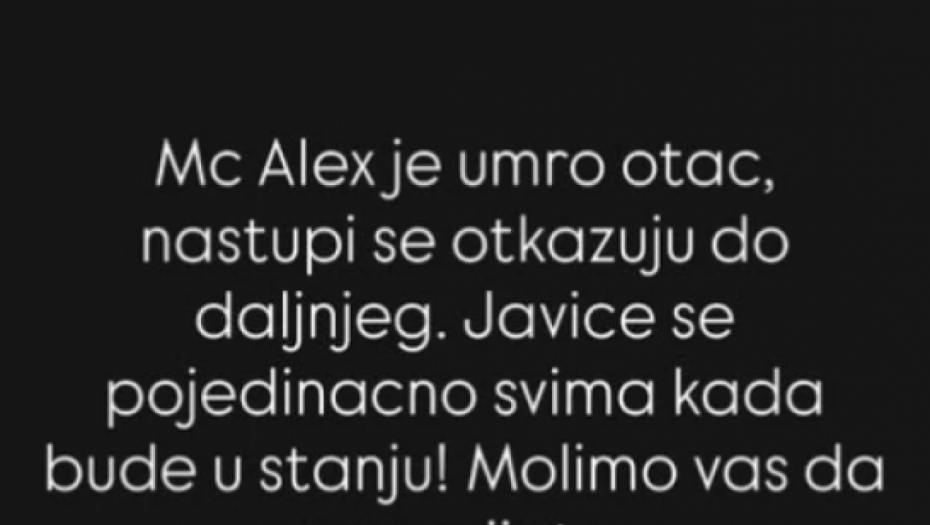- MC Aleks je umro otac, nastupi se otkazuju do daljnjeg. Javiće se pojedinačno svima kada bude u stanju! Molimo vas da razumete - glasila je druga objava.