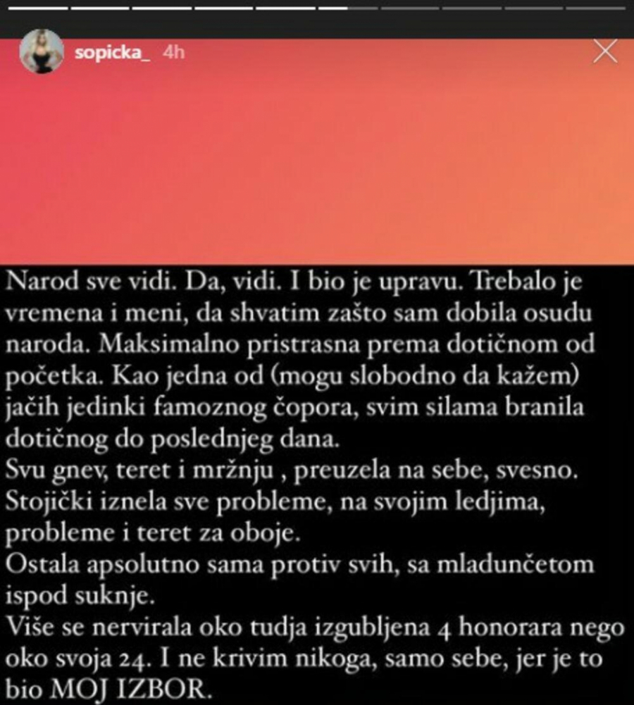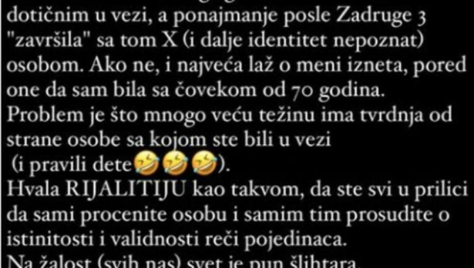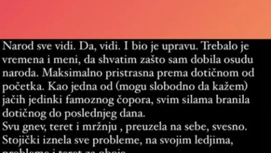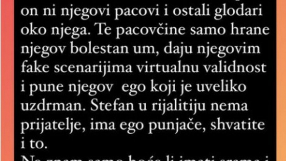- Nikada nisam karakterisala svoj moral kao neoboriv, ali moju iskrenost, čistu nameru i moju lojalnost dotičnom niko ne može da mi ospori, pa ni on, ni njegovi pacovi i ostali glodari oko njega. Te pacovčine samo hrane njegov bolestan um, daju njegovim fejk scenarijima virtuenu validnost i pune njegov ego, koji je uveliko uzdrman. Stefan u rijalitiju nema prijatelje, ima ego punjače, shvatite i to. Ne znam samo hoće li imati srama i stida da pogledaju u oči osobe poput mene, i ostale žrtve koje plaćaju cenu njihovog mizernog poltronstva, kojima svakodnevno svedočimo na TV ekranima - stoji u objavi.