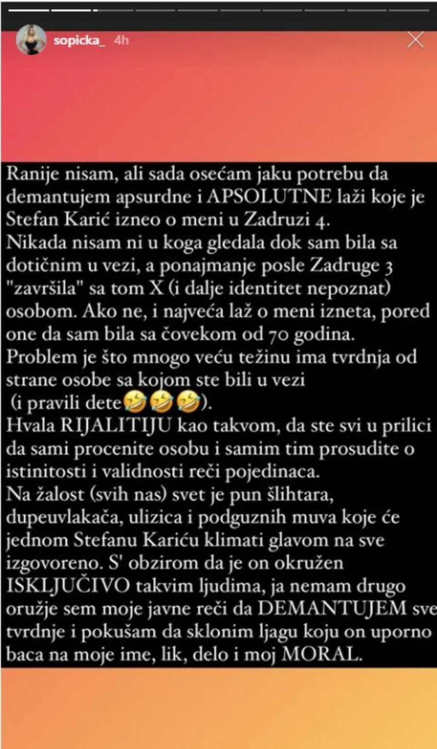 - Ranije nisam, ali sada osećam jaku potrebu da demantuje apsurdne i apsolutne laži koje je Stefan Karić izneo o meni u "Zadruzi 4". Nikada nisam ni u koga gledala dok sam bila sa dotičnim u vezi, a ponajmanje posle "Zadruge 3" "završila" sa tom X (i dalje identitet nepoznat) osobom. Ako ne, i najveća laž o meni izneta, pored one da sam bila sa čovekom od 70 godina. problem je što mnogo veću težinu ima tvrdnja od strane osobe sa kojom ste bili u vezi (i pravili dete). Hvala rijalitiju kao takvom, da ste svi u prilici da sami procenite osobu i samim tim prosudite o istinitosti i validnosti reči pojedinaca. Nažalost (svih nas), svet je pun šlihtara, dupeuvlakača, ulizica i podguznih muva, koje će jednom Stefanu Kariću klimati glavom na sve izgovoreno. S obzirom na to da je on okružen isključivo takvim ljudima, ja nemam drugo oružje, sem moje javne reči da demantuje sve tvrdnje i pokušavam da sklonim ljagu koju on uporna baca na moje ime, lik, delo i moj moral - napisala je Ivana, pa nastavila: