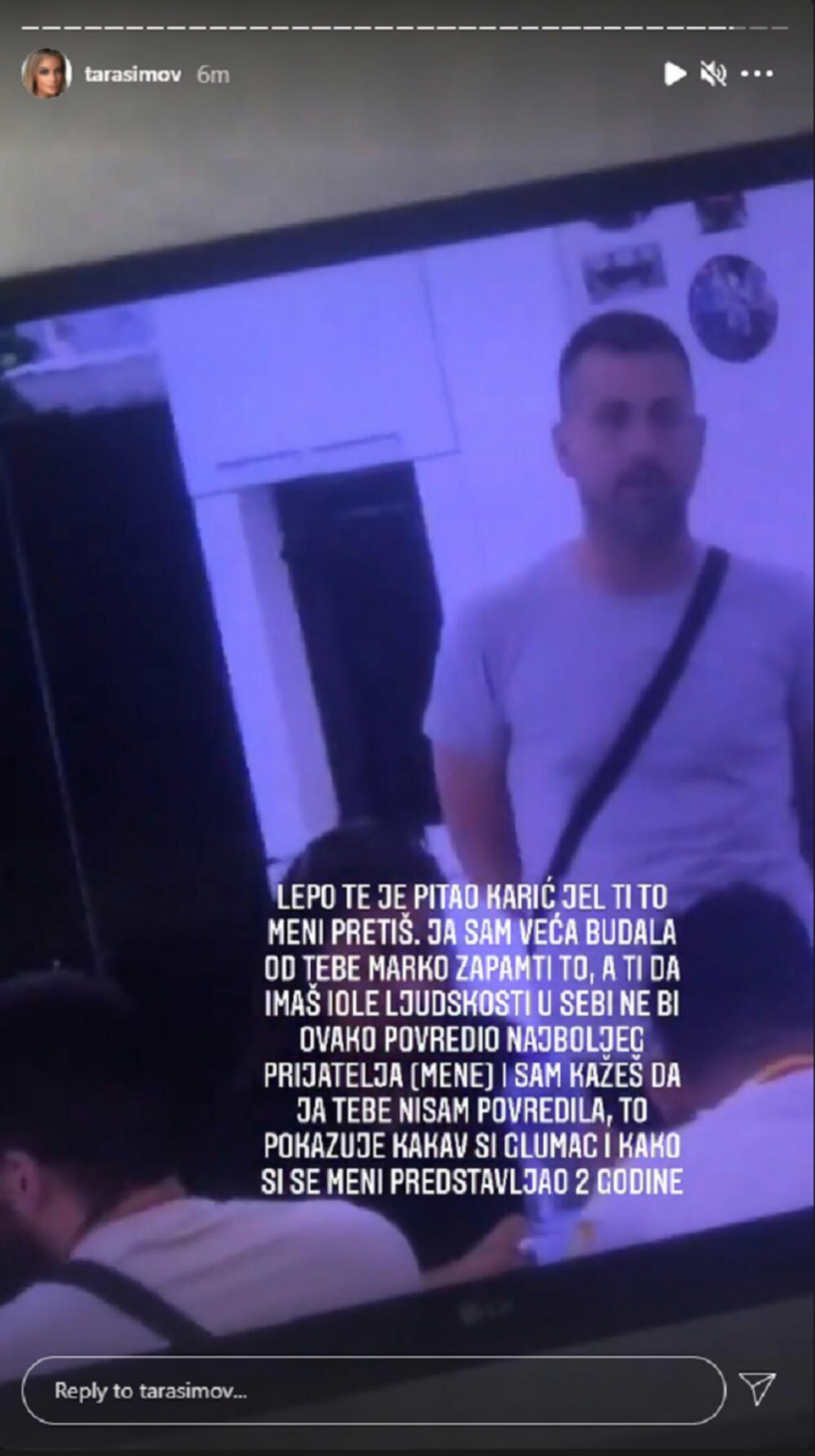 - Ili si ipak ti malo glup ko ku*ac pa javno priznaješ da manipulišeš ljudima da bi im se use*avao u živote i lažno im se predstavljaš kao što si i meni glumio prijatelja dve je*ene godine. Lepo te je pitao Karić je l ti to meni pretiš. Ja sam veća budala od tebe, Marko, zapamti to, a ti da imaš iole ljudskosti u sebi ne bi ovako povredio najboljeg prijatelja, i sam kažeš da te nisam povredila, to pokazuje kakav si glumac i kako si se meni predstavljao dve godine. Kaže Mića "Čekao je ovo dve godine", najteže će mi pasti, ali, Mićo, sve si bio u pravu za Marka - bile su reči koje je Tara uputila Marku Đedoviću.