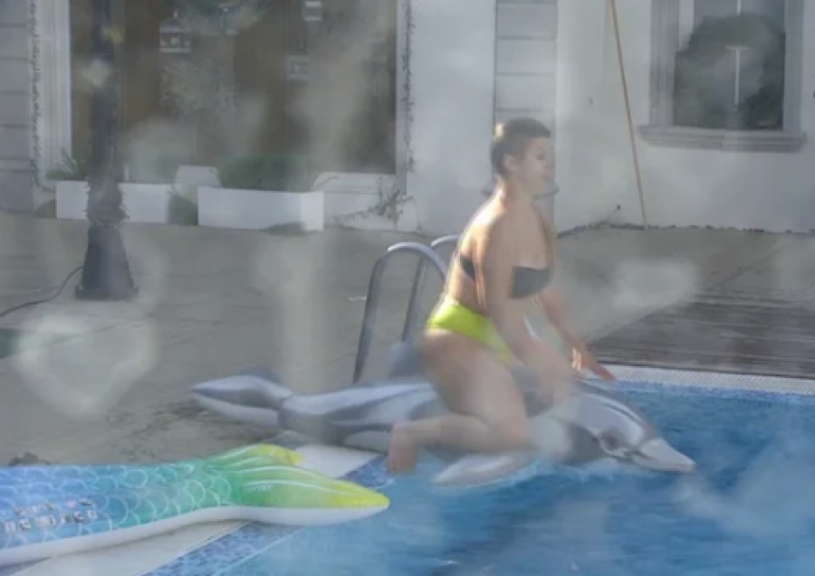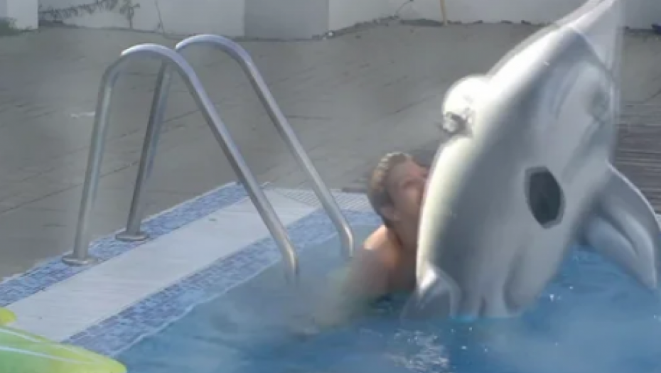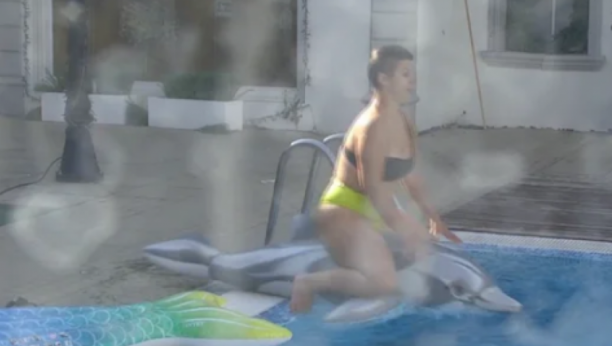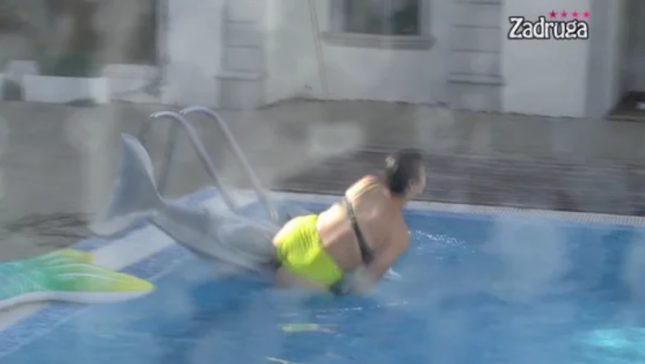 Miljana Kulić je nakon sunčanja uskočila u bazen, kako bi se malo osvežila. Odmah je uzela delfina na naduvavanje, sa kojim je mučila muku.