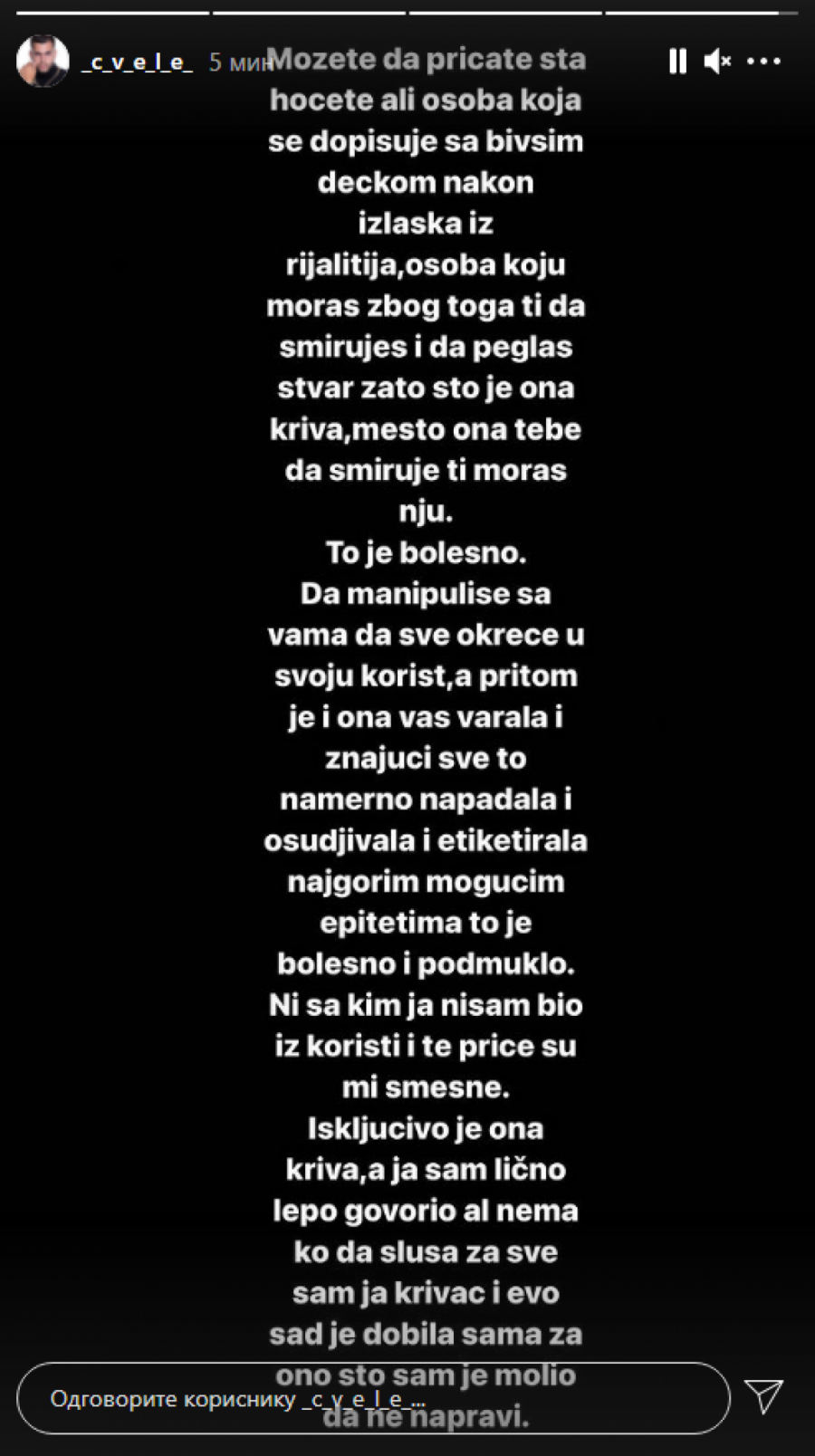 - Neću da ispadam budala i da ćutim kao u Zadruzi, za mnoge stvari sam ćutao i ispao gospodin, ali to ne zna da se ceni, za raskid i ovu situaciju ja nisam kriv i neću da me neko osuđuje. Pravi ljudi znaju situaciju i kapiraju sve. Niko na mom mestu ne bi trpeo ovakve stvari. Sebe ne opravdavam za stvari koje sam radio, ali je Cvele za sve to platio i to javno. I dok sam to plaćao držao sam sve u sebi i ćutao. Možete da pričate šta hoćete ali osoba koja se dopisuje sa bivšim dečkom nakon izlaska iz rijalitija, osoba koju moraš zbog toga ti da smirujes i da peglas stvar zato što je ona kriva, umesto ona tebe da smiruje ti moraš nju. To je bolesno. Da manipuliše sa vama da sve okreće u svoju korist, a pritom je i ona vas varala i znajući sve to namerno napadala, osušivala i etiketirala najgorim mogućim epitetima to je bolesno i podmuklo. Ni sa kim ja nisam bio iz koristi i te priče su mi smešne. Isključivo je ona kriva, a ja sam lično lepo govorio, ali nema ko da sluša, za sve sam ja krivac i evo sad je dobila sama za ono što sam je molio da ne napravi - opleo je Cvele po bivšoj i izneo potpuno nove detalje.