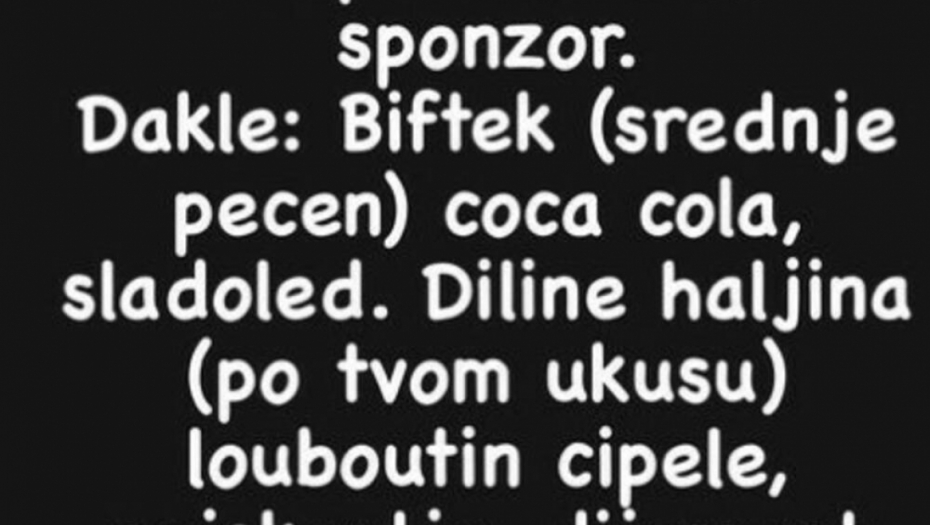 - Danas je tačno 182 dana od kad je Janjuš obećao da postaje moj sponzor. Dakle: Biftek (srednje pečen), sok, sladoled. Haljina (po tvom ukusu), cipele najskuplje, dijamant (prsten, može belo zlato) dovoljno veliki da me vuče ulevo. Za danas toliko. Voli te Sandra - napisala je pevačica.