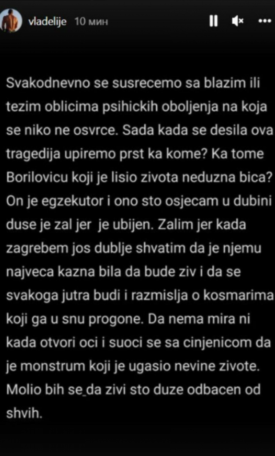 - Svakodnevno se susrećemo sa blažim ili težim oblicima psihičkih oboljenja na koja se niko ne osvrće. Sada kada se desila ova tragedija upiremo prst ka kome? Ka tome Boriloviću koji je lišio života nedužna bića? On je egzekutor i ono što osećam u dubini duše je žal jer je ubijen. Žalim jer kada zagrebem još dublje shvatim da je njemu najveća kazna bila da bude živ i da se svakoga jutra budi i razmišlja o košmarima koji ga u snu progone. Da nema mira ni kada otvori oči i suoči se sa činjenicom da je monstrum koji je ugasio nevine živote. Molio bih se da živi što duže odbačrn od shvih", napisao je Tomović.