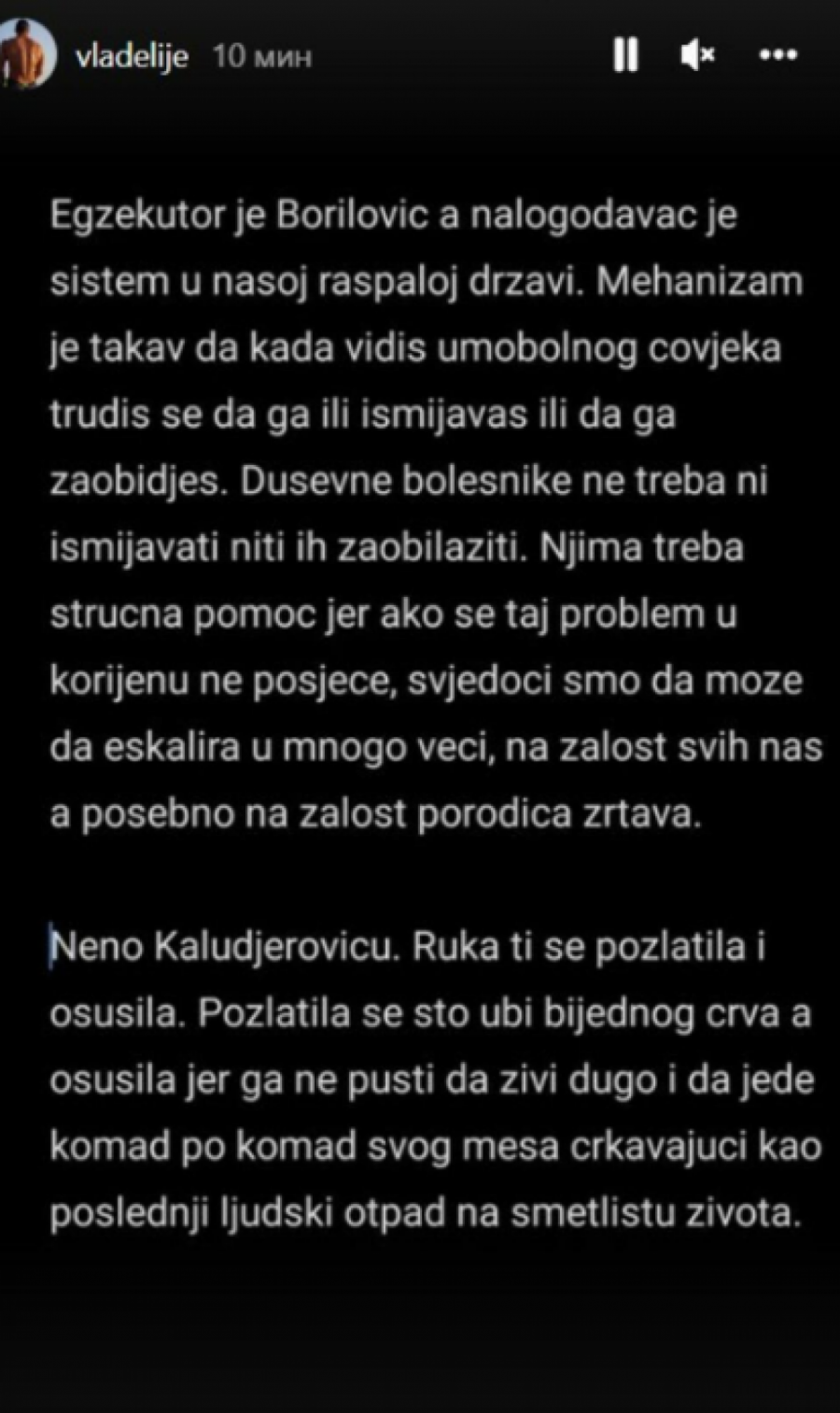 Egzekutor je Borilović, a nalogodavac je sistem u našoj raspaloj državi. Mehanizam je takav da kada vidiš umobolnog čoveka trudiš se da ga ili ismeavaš ili da ga zaobiđes. Duševne bolesnike ne treba ni ismravati niti ih zaobilaziti. Njima treba stručna pomoć jer ako se taj problem u korenu ne poseće, svedoci smo da može da eskalira u mnogo veći, nažalost svih nas a posebno na žalost porodica žrtava. Neno Kaluđeroviću. Ruka ti se pozlatila i osušila. Pozlatila se sto ubi bednog crva a osušila jer ga ne pusti da živi dugo i da jede komad po komad svog mesa crkavajući kao poslednji ljudski otpad na smetlistu života", završio je Tomović.