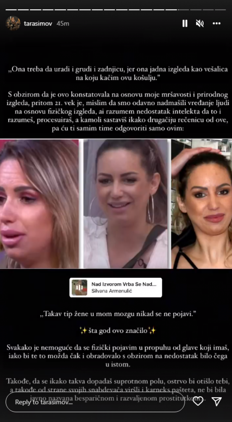 - S obzirom da je ovo konstatovala na osnovu moje mršavosti i prirodnog izgleda, pritom 21. vek je, mislim da smo odavno nadmašili vređanje ljudi na osnovu fizičkog izgleda, a i razumem nedostatak intelekta da to i razumeš, procesuiraš, a kamoli sastavis ikako drugačiju rečenicu od ove, pa ću ti samim time odgovoriti samo ovim: "Takav tip žene u mom mozgu nikad se ne pojavi.". Šta god ovo značilo. Svakako je nemoguće da se fizički pojavim u propuhu od glave koji imaš, iako bi te to možda čak i obradovalo s obzirom na nedostatak bilo čega u istom. Takođe, da se ikako takva dopadaš suprotnom polu, ostrvo bi otišlo tebi, a takođe od strane svojih snabdavača viršli i pašteta, ne bi bila javno nazvana besparičnom i razvaljenom prostitutkom - bila je brutalna Tara Simov kao i uvek, a onda je u drugom storiju napisala "Kako dupe umesto sisa" i dodatno je ponizila.