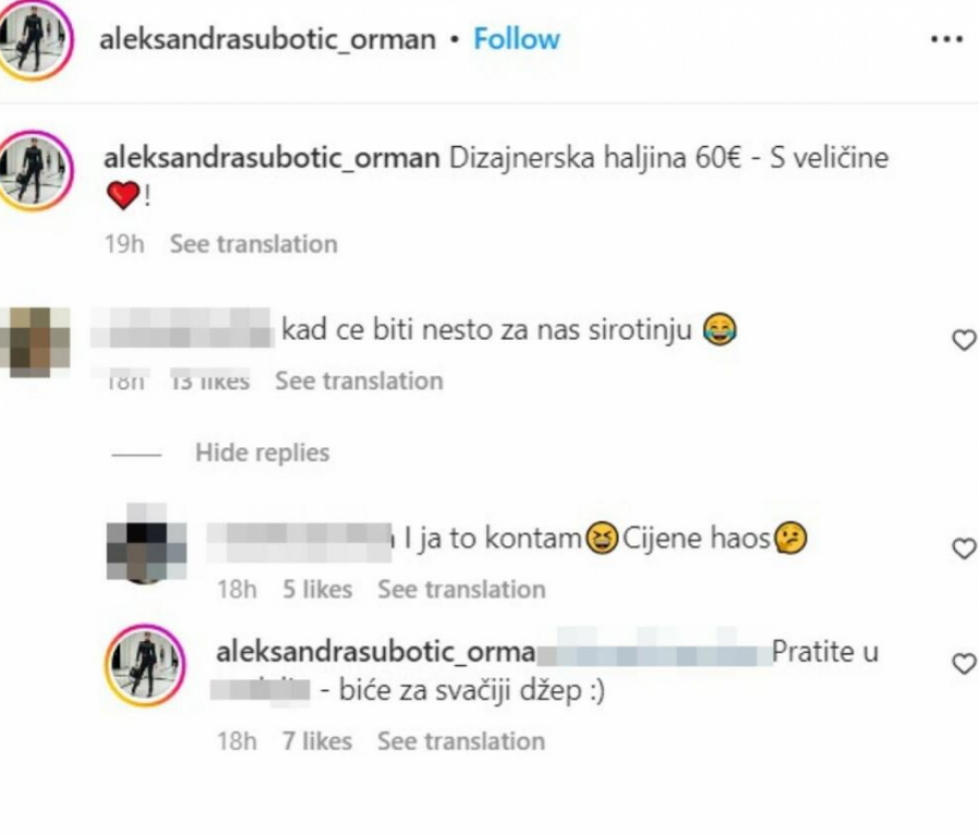 "Čekaj, je l' realno da ova prodaje polovne kopije i to za 150 evra?! Sad sam sve čuo", "Ova gora od Dabovićke", "Kako se žena ukanali, sad priznade da sve nosi kopije, a ovamo kao luksuzan život", "Ostavite ženu na miru, meni je mnogo poštenije što je rekla da su kopije nego da na prevaru prodaje falš", "Meni je ovo skroz okej i cena, i garderoba, a pritom je i pristupačno nekome ko voli da ima nešto što je ona nosila", nizali su se podeljeni komentari na Tviteru.