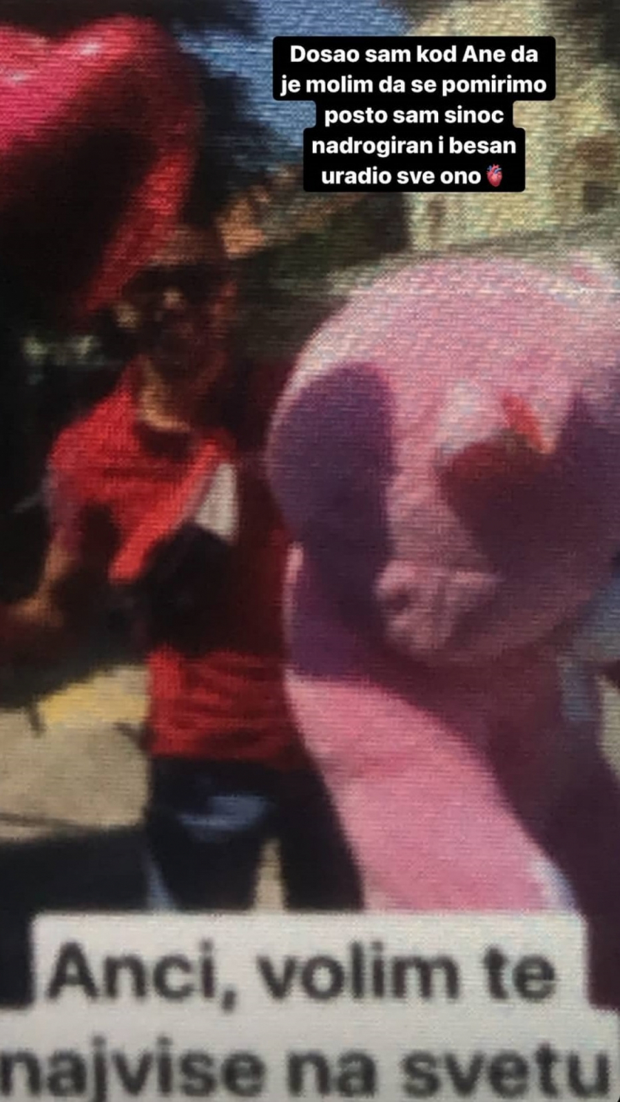 - "Došao sam kod Ane da je molim da se pomirimo, pošto sam sinoć bio nadrogiran i besan uradio sve ono", "Anči, volim te najviše na svetu", pisalo je u opisu fotografije koja je objavljena, a zanimljiv je i sam naziv Instagram naloga - "Ana, izvini, volim te najviše".