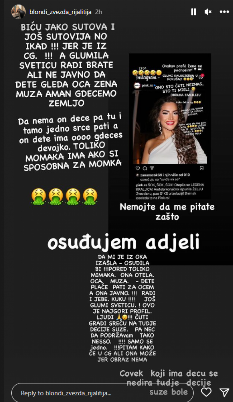Biću jako surova, surovija nego ikad jer je iz Crne Gore. Glumila je sveticu. Radi, brate, ali ne javno, da dete gleda, otac, žena, muž... Aman, gde ćemo, zemljo? Da nema on decu, pa tu i tamo, jedno srce pati. A on dete ima, o, gde ćeš, devojko? Toliko momaka ima ako si spobosna za momka. Nemojte da me pitate zašto osuđujem Anđelu. Da mi je iz oka izašla, osudila bih je. Pored toliko momaka, ona otela oca, muža. Dete plače, pati za ocem, a ona javno radi i j*be, kuku! Još glumi sveticu. Ovo je najgori profil ljudi. Ćuti! Gradi sreću na suzama tuđeg deteta. Pa neću da podržim tako nešto. Samo jedno se pitam, kako će ona u Crnu Goru? Ali ona može, jer obraza nema. Čovek koji ima decu se ne dira - napisala je Suzana.