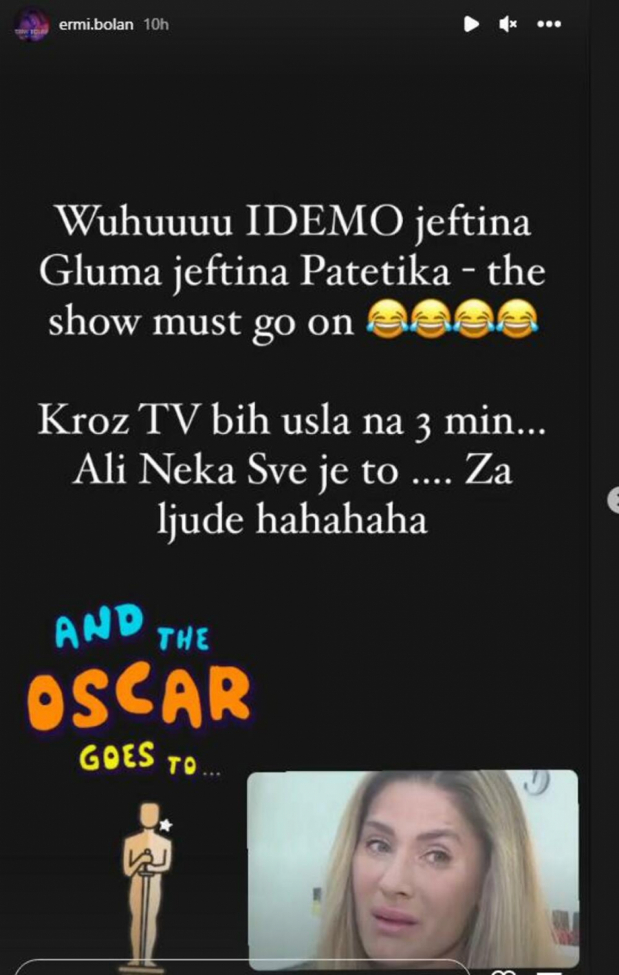 - Vuhu, idemo jeftina gluma, jeftina patetika - šou može da počne. Kroz TV bih ušla na tri minuta, ali neka sve je to za ljude. Oskar ide.. Ani - napisala je Ermina.